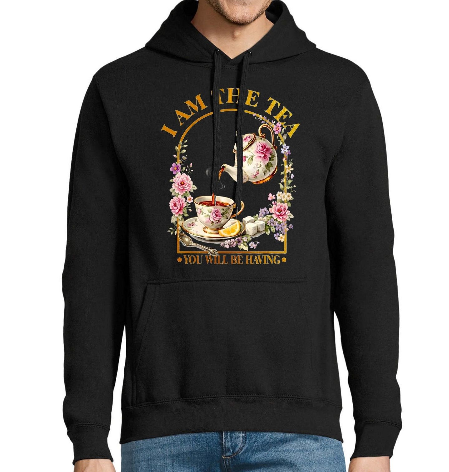 Pánská mikina Drby u Čaje I am the tea you will be having. I am the tea you will be having česky Já jsem ten čaj, který budeš pít. Elegantní a jemný motiv, který spojuje lásku k čaji a pořádné drby. Květinový porcelán, šálek horkého čaje a sladké detaily vytváří dokonalou atmosféru klidného posezení – ideálně s kamarádkou a dobrou konverzací. „The tea“ v angličtině neznamená jen čaj, ale taky slangově drby / gossip