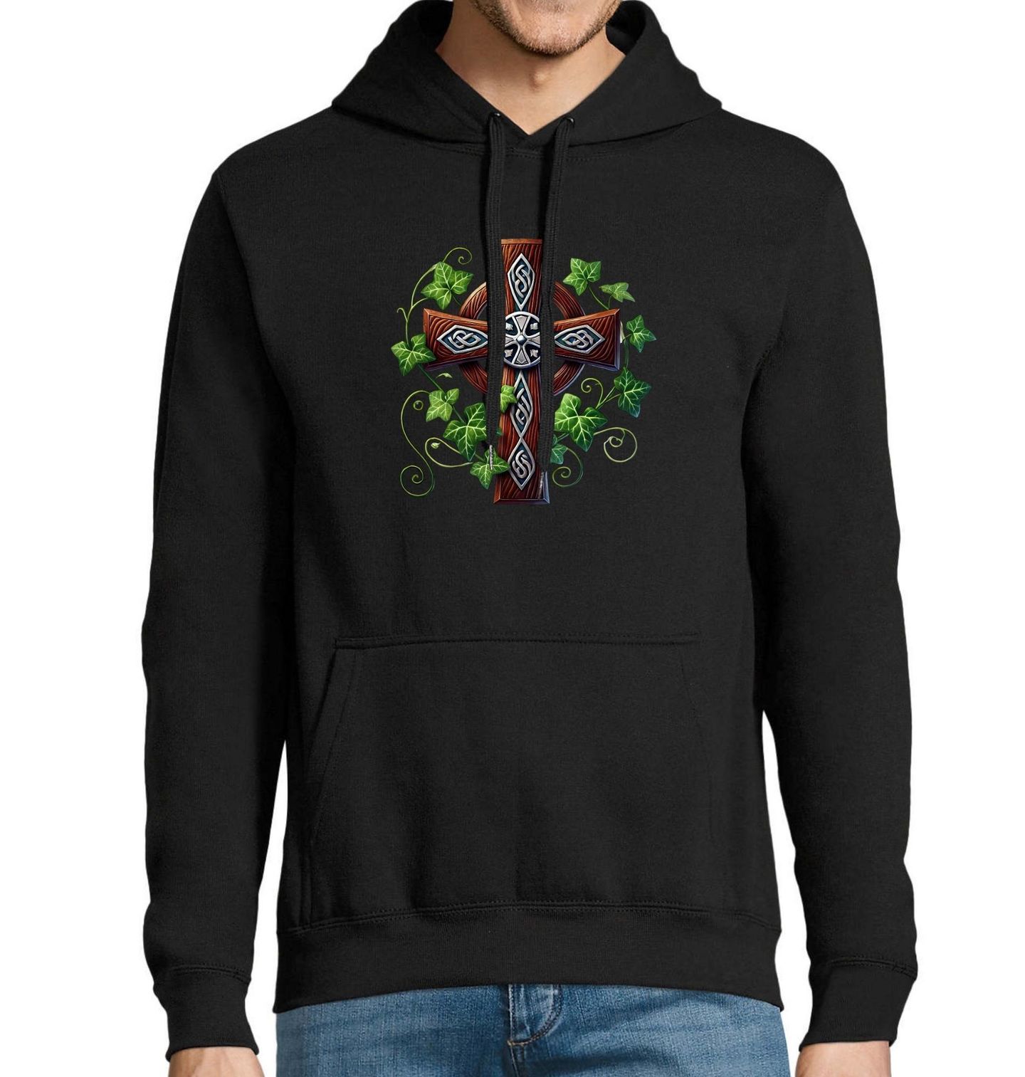 Pánská mikina Dřevěný Keltský Kříž. Propletený kříž symbolizuje věčnost, jednotu a ochranu, zatímco břečťan představuje životní sílu a odolnost v čase. Design je inspirován tradičním keltským uměním, s důrazem na detail a harmonii mezi přírodou a spiritualitou. Ideální pro každého, kdo hledá spojení historie a víry.