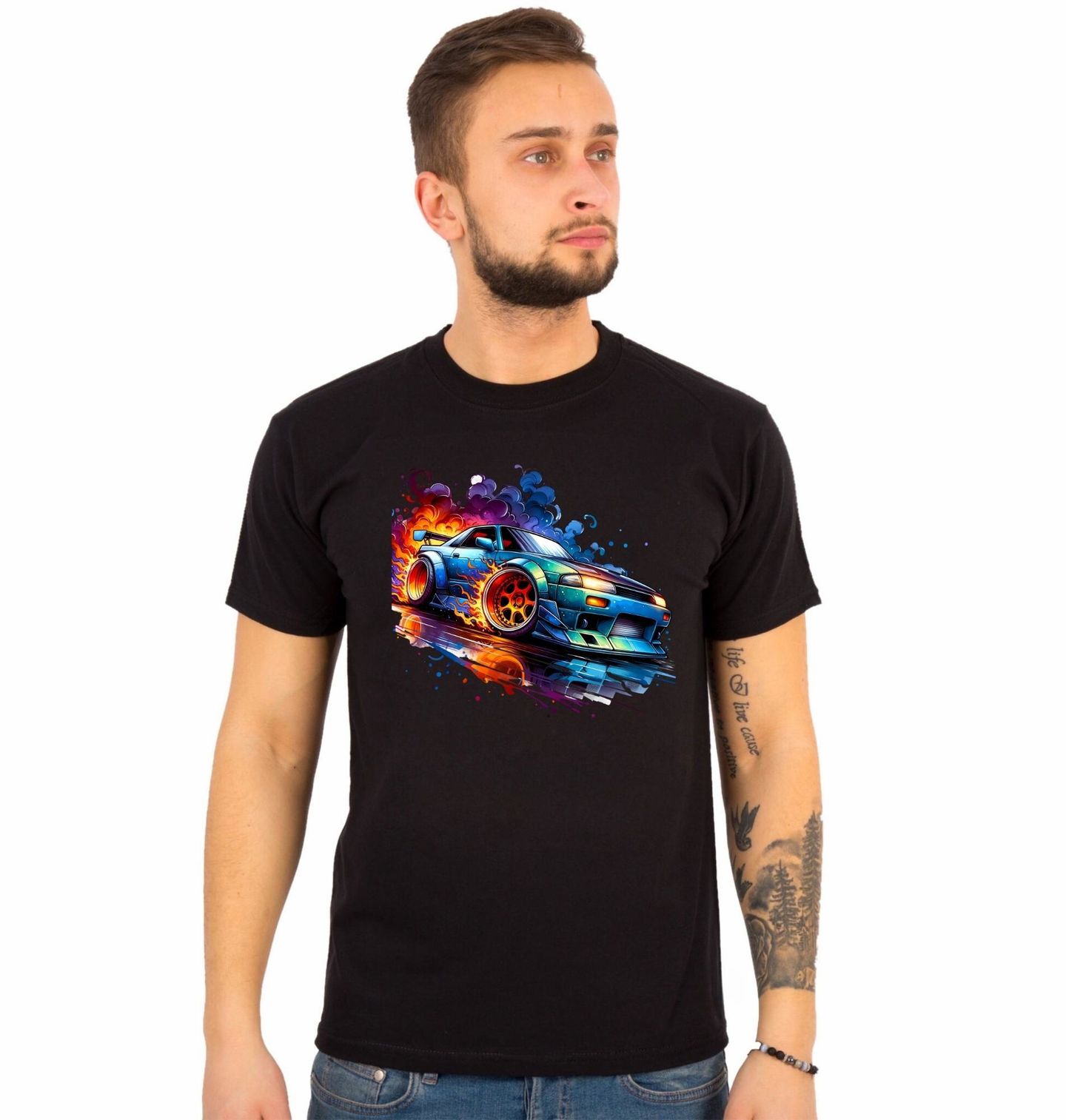 Pánské tričko Driftující Auto v Plamenech. Pekelné auto v plamenech je poctou všem, kdo žijí rychlostí. Design zachycuje výbušný moment, kdy se auto řítí bokem v dokonalém driftu, obklopené ohněm, dýmem a neonovým světlem. Tahle grafika je pro ty, kdo milují turbo, vůni asfaltu a noční jízdy, kde se rozmazává realita i světla.