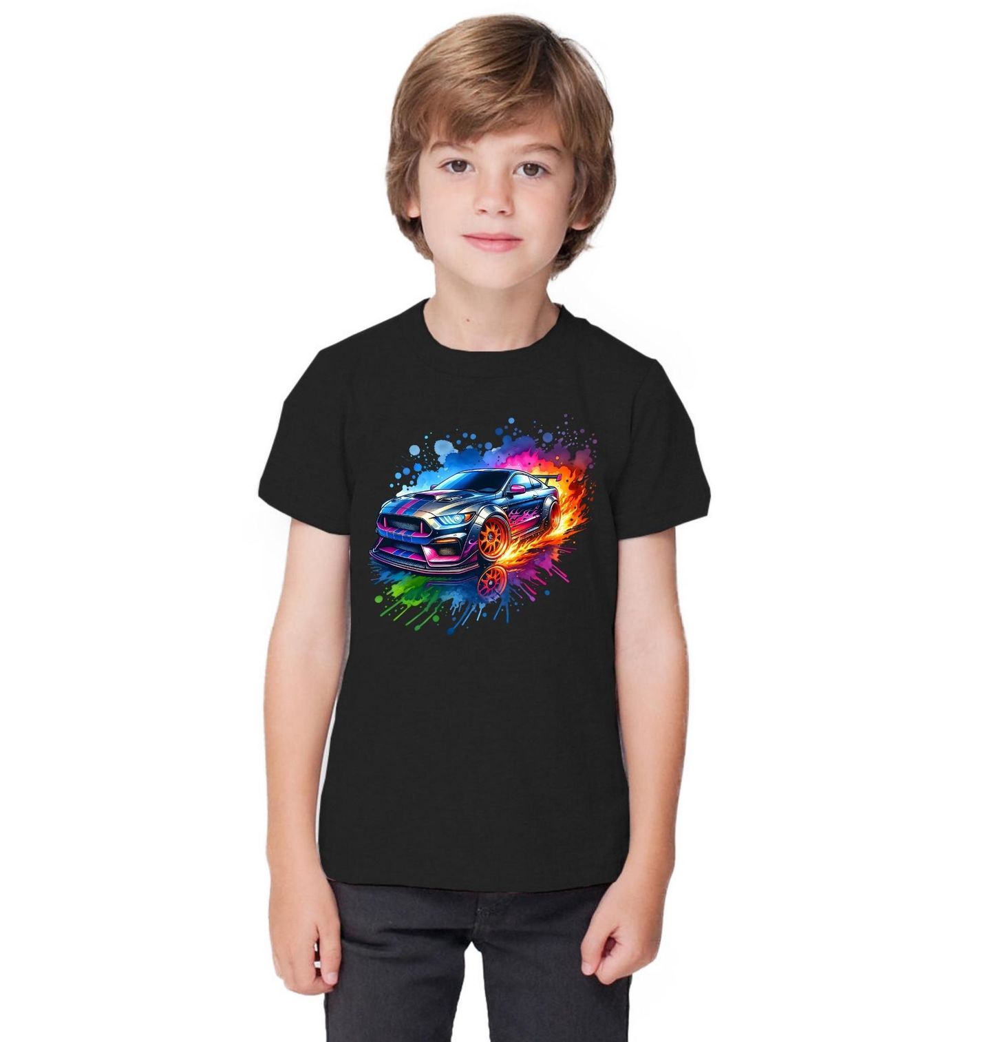 Dětské tričko Driftující Muscle Car. Neonové auto v plamenech zachycuje čistou esenci motorsportu – auto na hraně kontroly, pálící pneumatiky a drift, který rozsvítí noc. Detailní ilustrace září neonovými odstíny modré, růžové a oranžové, zatímco zpod kol šlehají plameny. Ideální pro fanoušky driftu, tuningu a JDM kultury.