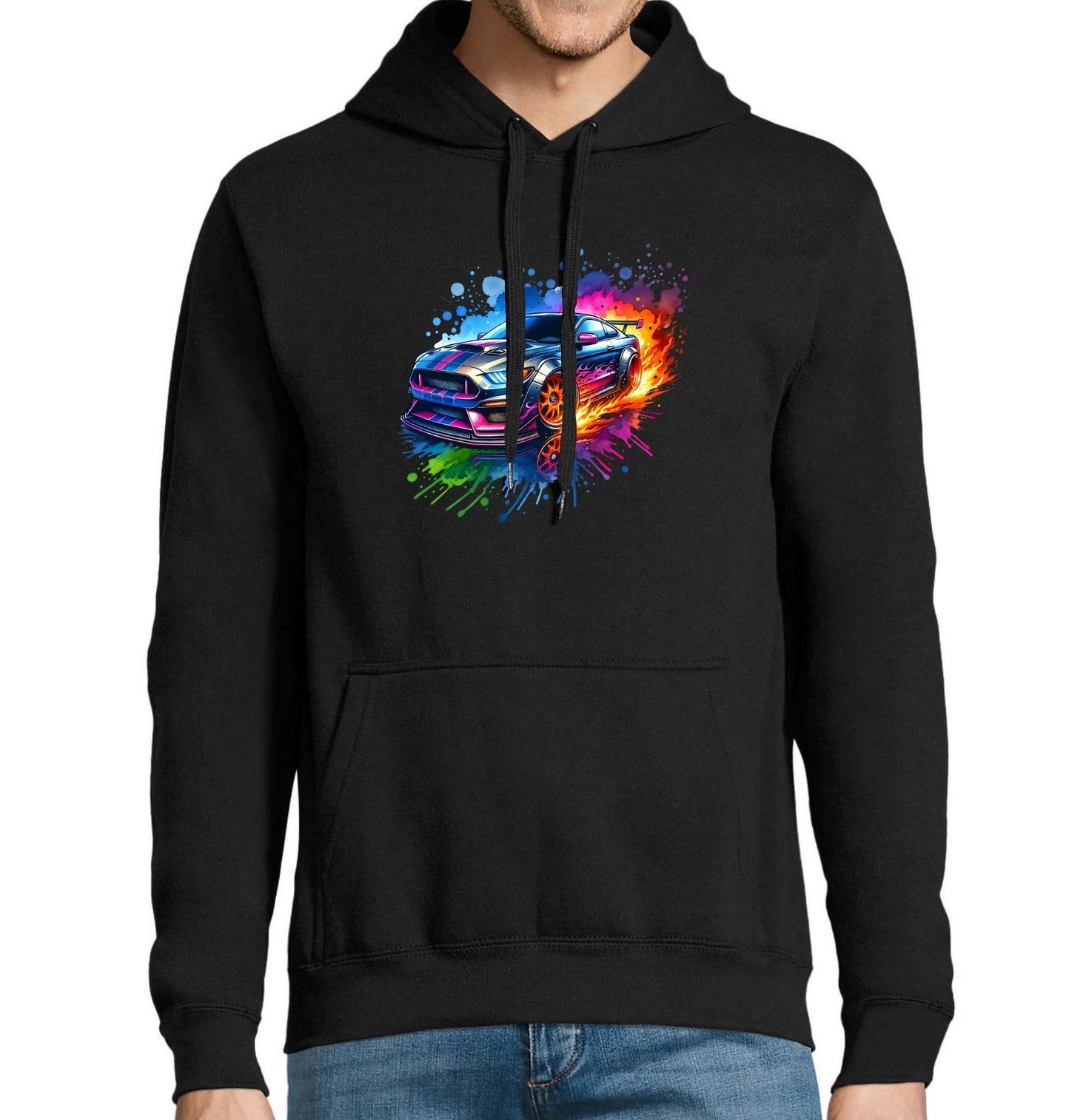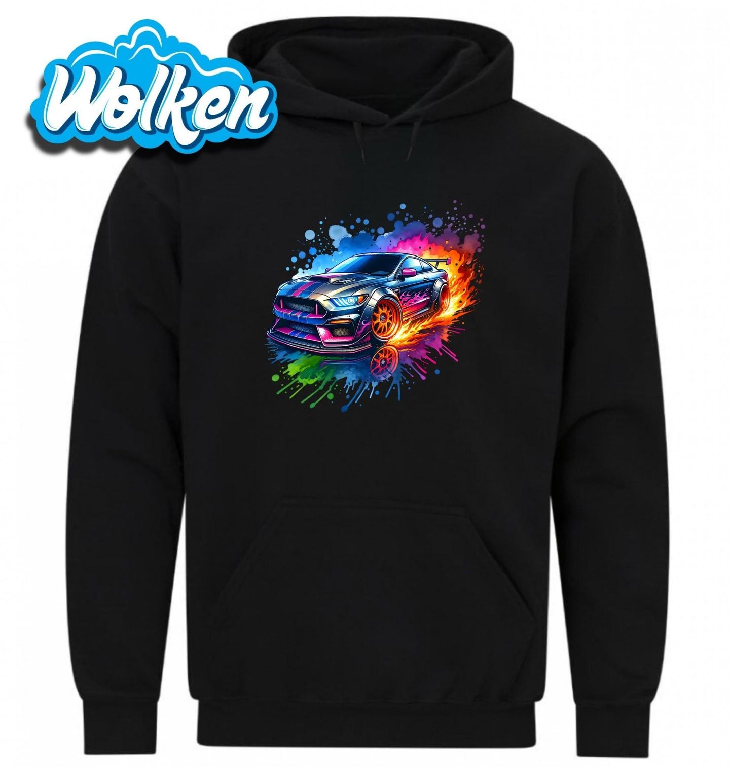 Pánská mikina Driftující Muscle Car. Neonové auto v plamenech zachycuje čistou esenci motorsportu – auto na hraně kontroly, pálící pneumatiky a drift, který rozsvítí noc. Detailní ilustrace září neonovými odstíny modré, růžové a oranžové, zatímco zpod kol šlehají plameny. Ideální pro fanoušky driftu, tuningu a JDM kultury.