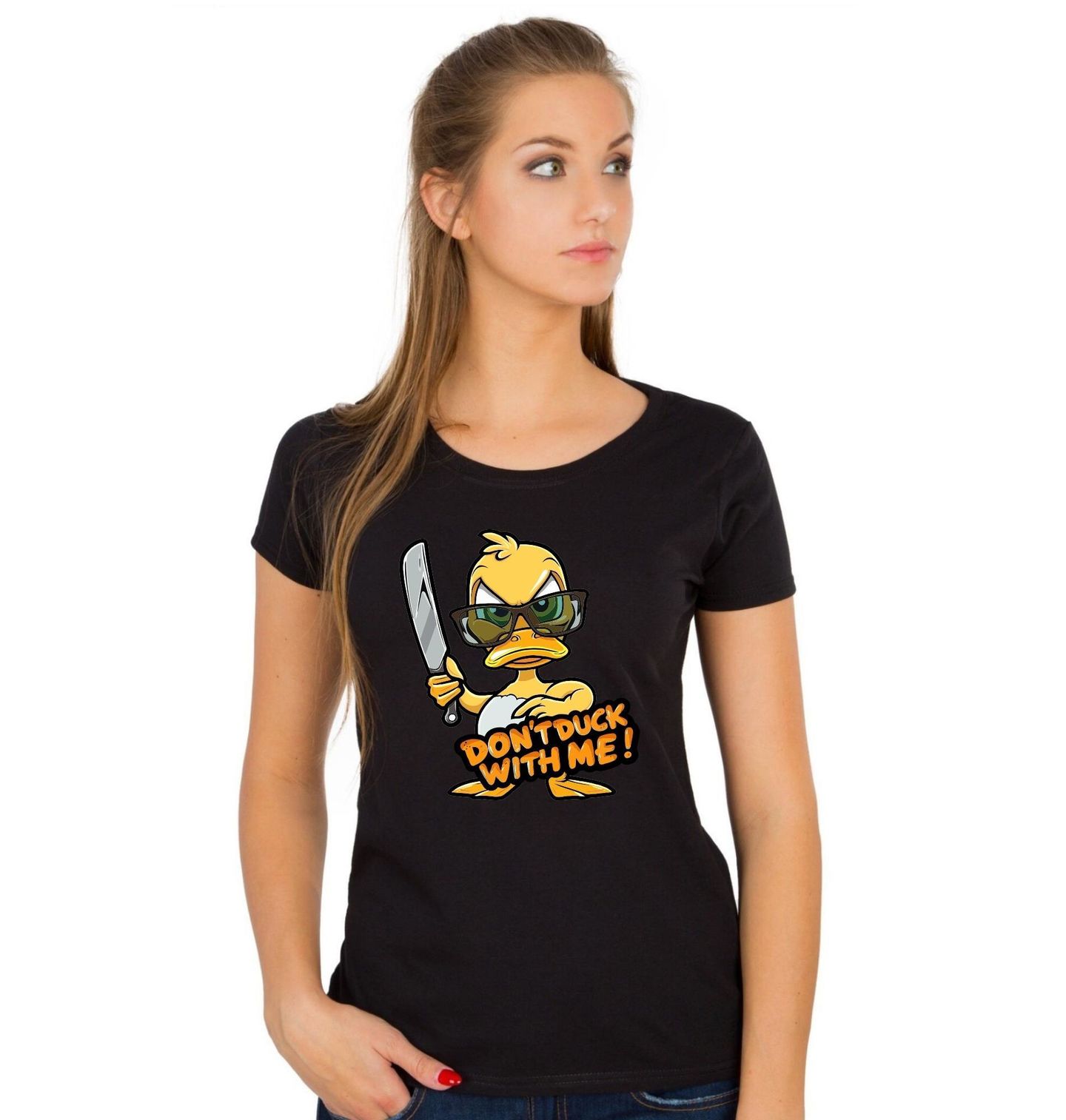 Dámské tričko Drsná Kachna s Nožem Don’t Duck With Me. Originální a odvážný motiv s textem „DON’T DUCK WITH ME!“, který vtipně parafrázuje anglickou frázi a znamená: „Nezahrávej si se mnou!“ Tuto hlášku doplňuje stylová ilustrace, kde hlavní roli hraje drsná kachna se slunečními brýlemi a nožem, připravená bránit svůj prostor. Tato výrazná kachna kombinuje humor, nadsázku a lehce rebelantský styl, díky čemuž zaujme na první pohled.