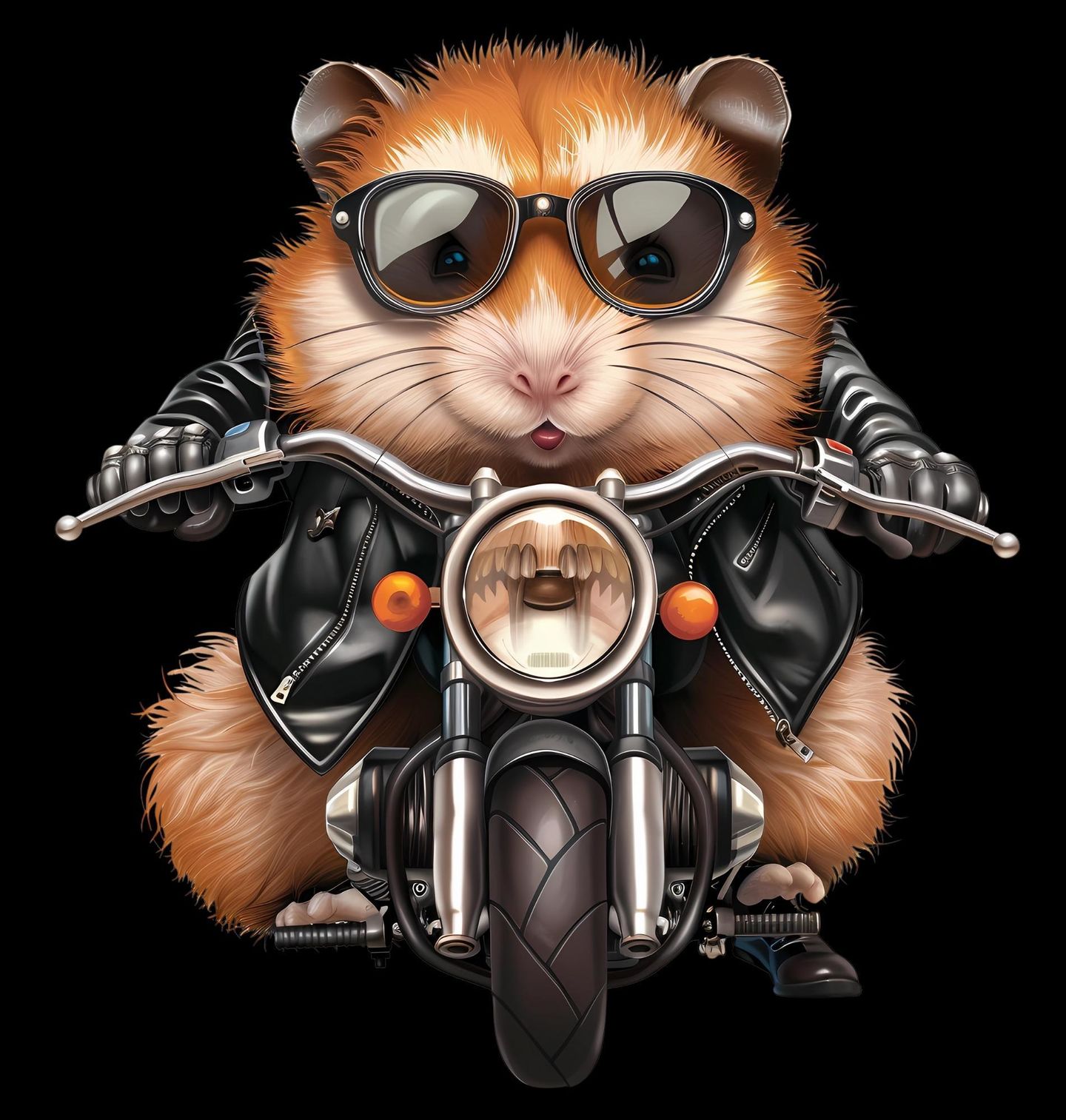 Pánské tričko Drsný Křeček Motorkář. Tenhle křeček to vážně rozjel! V kožené bundě, slunečních brýlích a na silné motorce vypadá jako šéf silnic… i když mu sotva kouká hlava nad nádrž. Ideální motiv pro všechny milovníky zvířat, humoru a pořádného motorkářského stylu, protože motorka je pro každého.