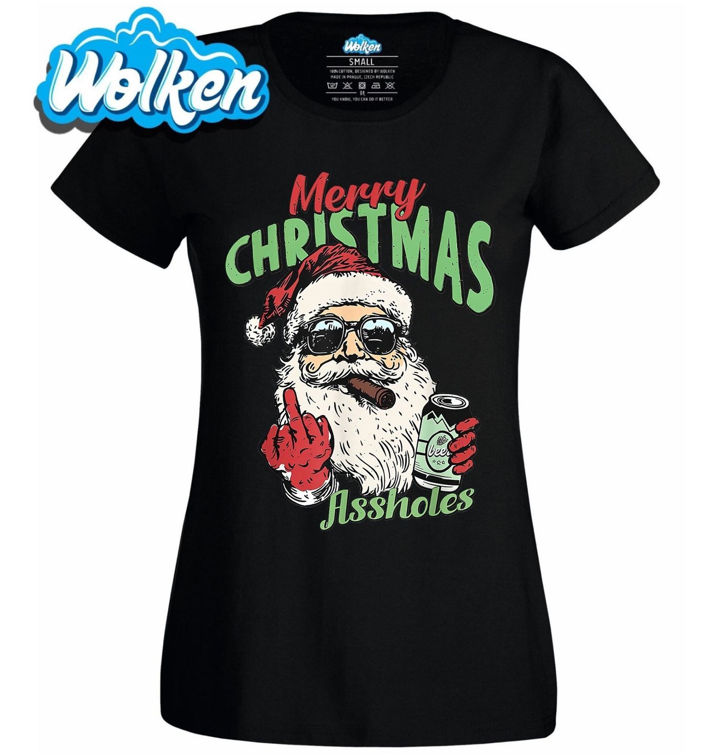 Dámské tričko Drsný Santa s Doutníkem Merry Christmas Assholes. Pro všechny, co mají smysl pro černý humor a Vánoce berou s nadhledem. Stylový potisk s pořádně drsným Santou, který místo zvonečku zvedá prostředníček, drží pivo a v puse mu hoří doutník. Merry Christmas Assholes – Veselé Vánoce, hajzlíci.