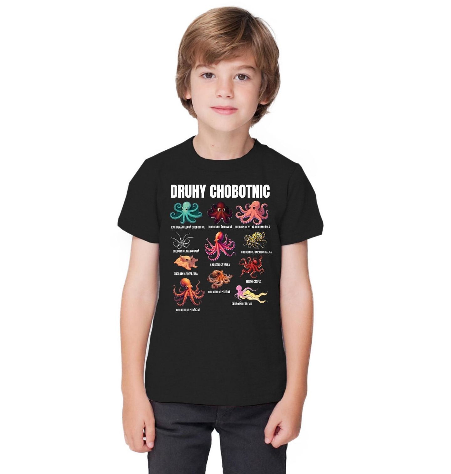 Dětské tričko Druhy Chobotnic. Na motivu najdeš různé druhy jako karibská útesová chobotnice, chobotnice žilkovaná, chobotnice velká tichomořská, chobotnice maskovaná, chobotnice hapalochlaena, chobotnice depressa, chobotnice velká, benthoctopus, chobotnice pobřežní, chobotnice písečná a chobotnice tremo. Tento motiv chobotnice je ideální pro milovníky přírody, oceánů a podmořského života.