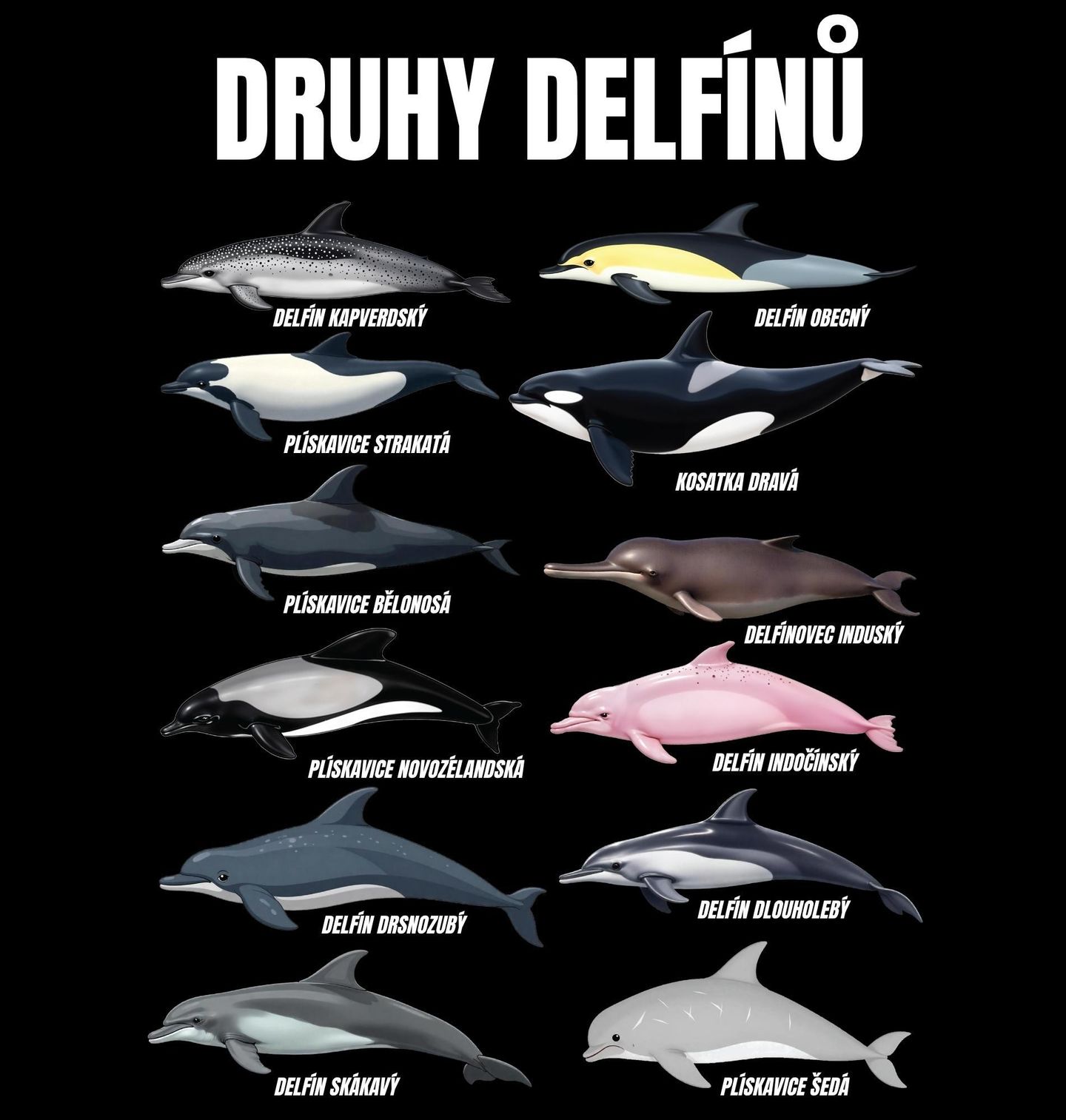 Dámské tričko Druhy Delfínů. Na motivu najdeš různé druhy jako delfín kapverdský, delfín obecný, plískavice strakatá, kosatka dravá, plískavice bělonosá, delfínovec induský, plískavice novozélandská, delfín indočínský, delfín drsnozubý, delfín dlouholebý, delfín skákavý a plískavice šedá. Díky tomu si snadno osvojíš rozmanitost, jakou delfín v oceánech představuje.