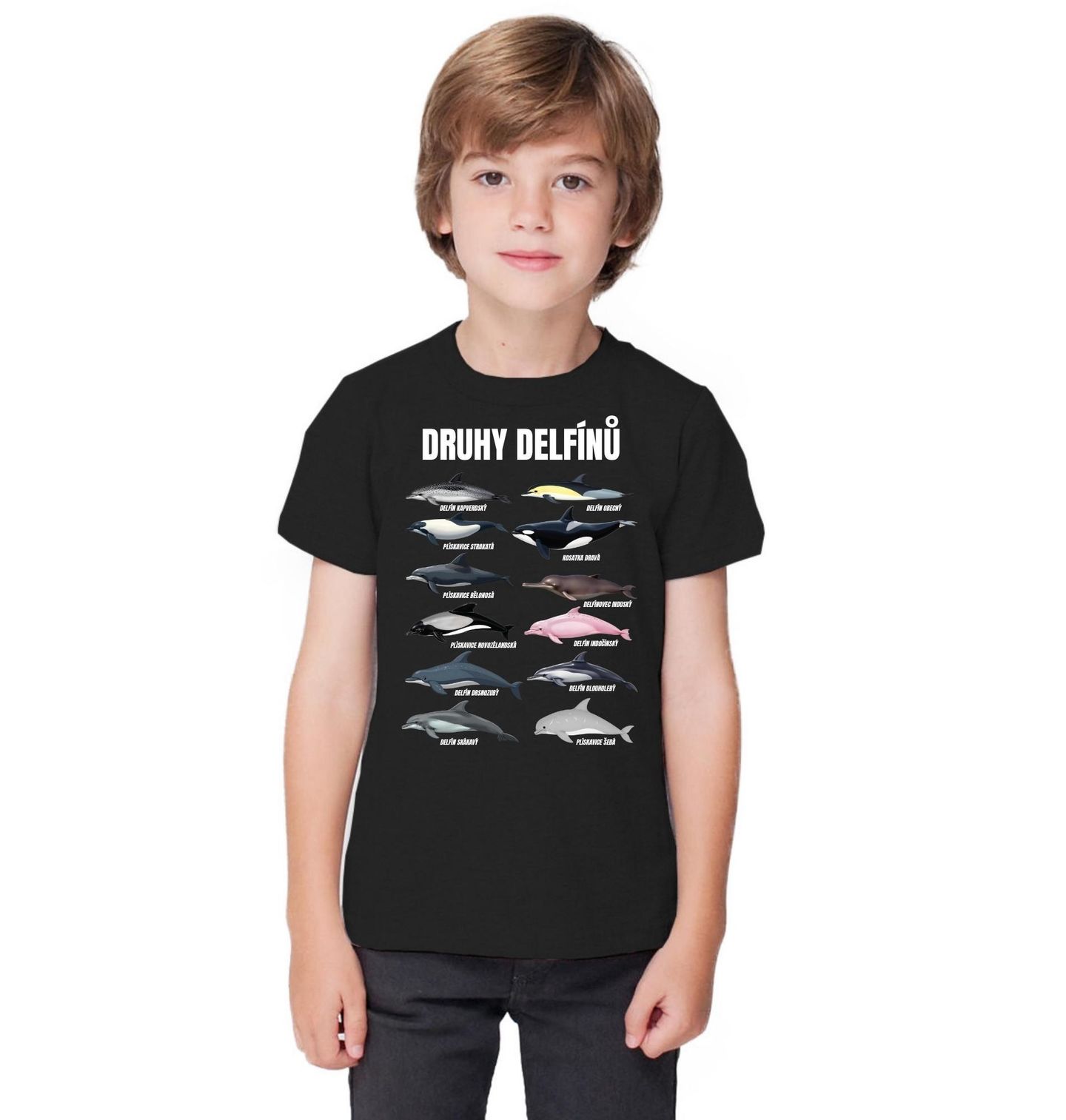 Dětské tričko Druhy Delfínů. Na motivu najdeš různé druhy jako delfín kapverdský, delfín obecný, plískavice strakatá, kosatka dravá, plískavice bělonosá, delfínovec induský, plískavice novozélandská, delfín indočínský, delfín drsnozubý, delfín dlouholebý, delfín skákavý a plískavice šedá. Díky tomu si snadno osvojíš rozmanitost, jakou delfín v oceánech představuje.