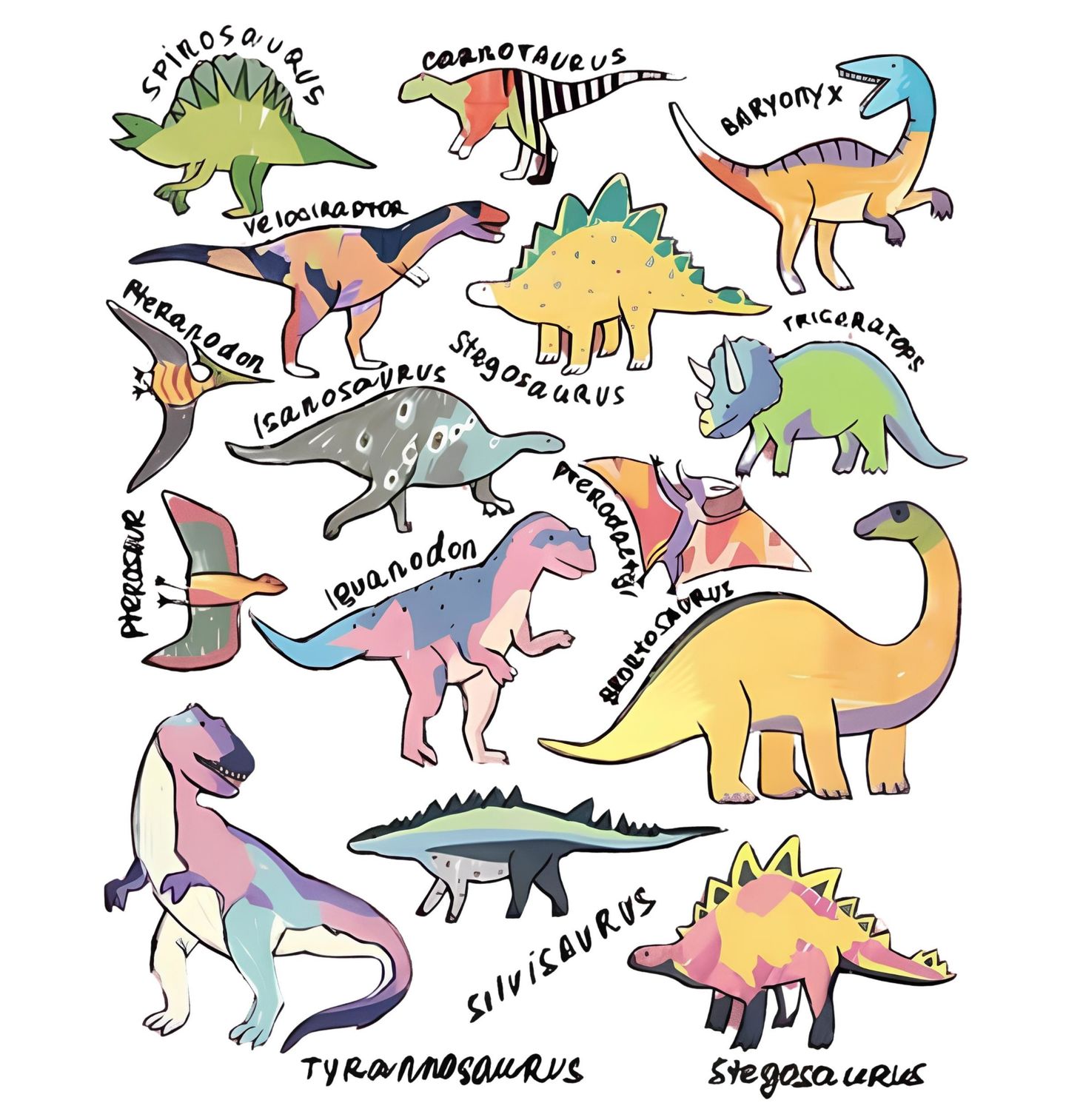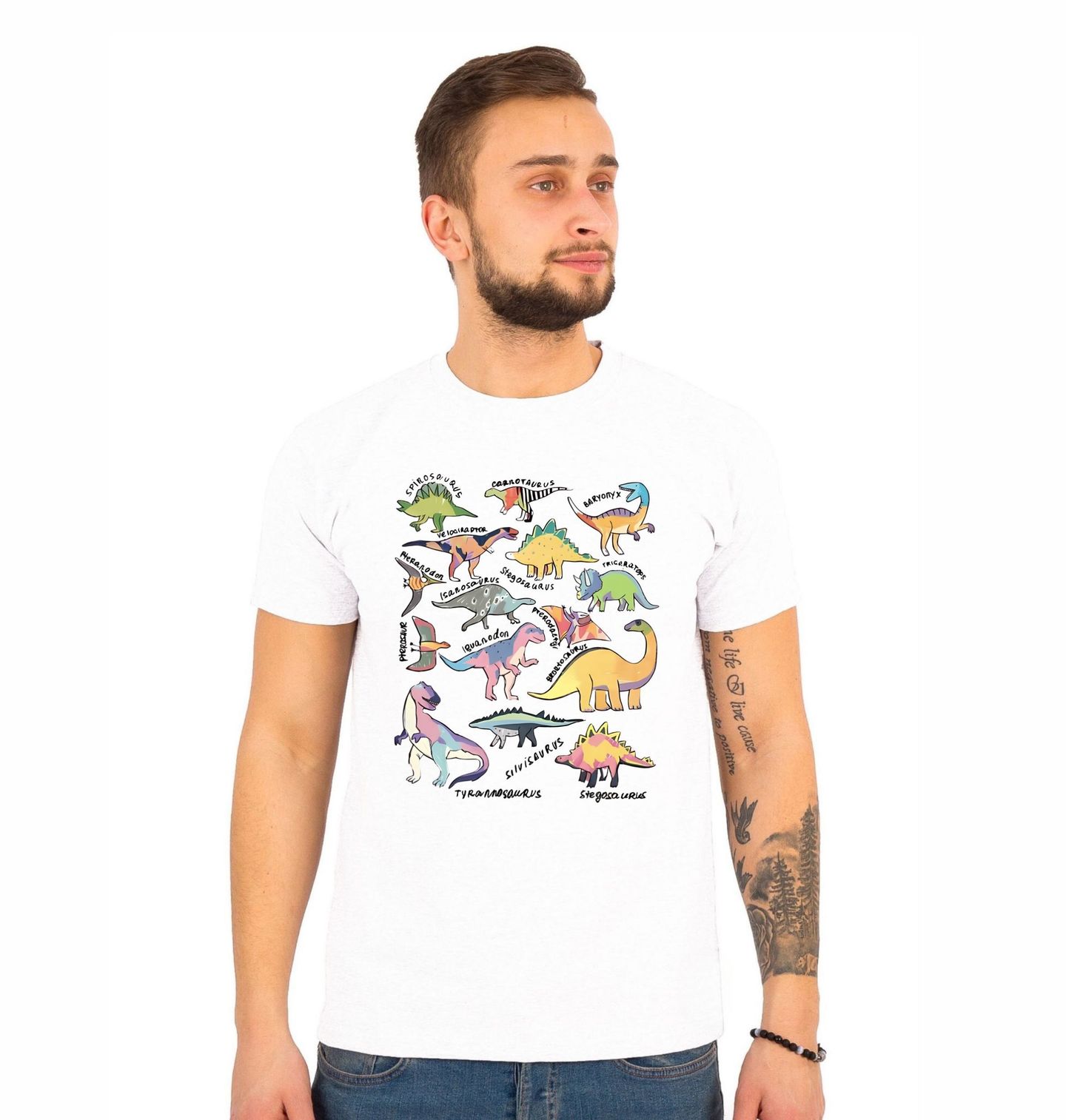 Pánské tričko Druhy Dinosaurů. Hravé a barevné ilustrace dinosaurů s motivy jako Spinosaurus, Carnotaurus, Baryonyx, Velociraptor, Stegosaurus, Triceratops, Pteranodon, Iguanodon, Tyrannosaurus a další potěší všechny malé i velké fanoušky pravěku. Každý dinosaurus je stylizovaný a zároveň popsaný, což dodává designu edukativní nádech. Tento motiv je ideální pro milovníky dinosaurů, prehistorie a dětských ilustrací, kteří chtějí spojit zábavu s poznáváním světa pravěkých tvorů.