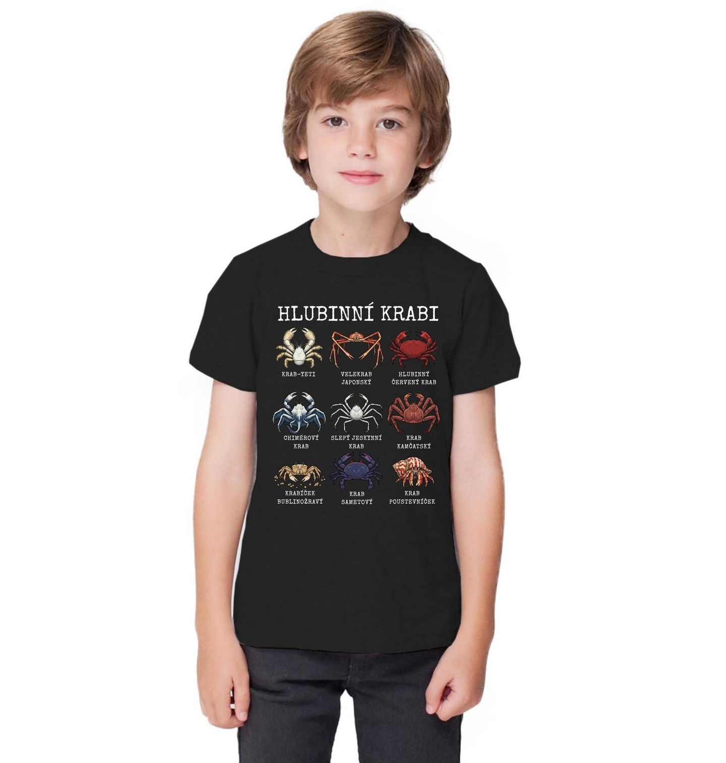 Dětské tričko Druhy Hlubinných Krabů. Ideální dárek pro milovníky oceánu, mořského života a netradičních tvorů. Na motivu jsou Hlubinní Krabi: Krab-Yeti, Velekrab Japonský, Hlubinný Červený Krab, Chimérový Krab, Slepý Jeskynní Krab, Krab Kamčatský, Krabíček Bublinožravý, Krab Sametový, Krab Poustevníček.