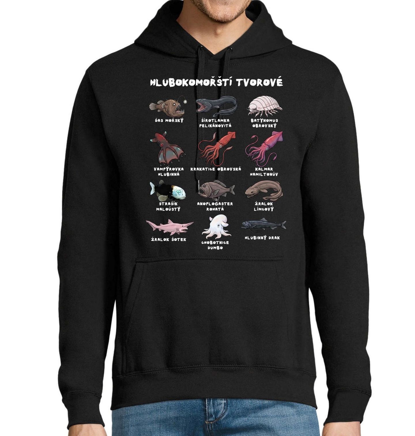 Pánská mikina Druhy Hlubokomořských Tvorů. Tento detailní a stylový design potěší každého, koho zajímají ryby, podmořský život a tajemné tvory žijící v temných hlubinách oceánu. Hlubokomořští tvorové: Ďas mořský, Sirotlamka pelikánovitá, Batynomus obrovský, Vampýrovka hlubinná, Krakatice obrovská, Kalmar hamiltonův, Strašík malouštý, Anoplogaster rohatá, Žralok límcový, Žralok šotek, Chobotnice Dumbo, Hlubinný drak.