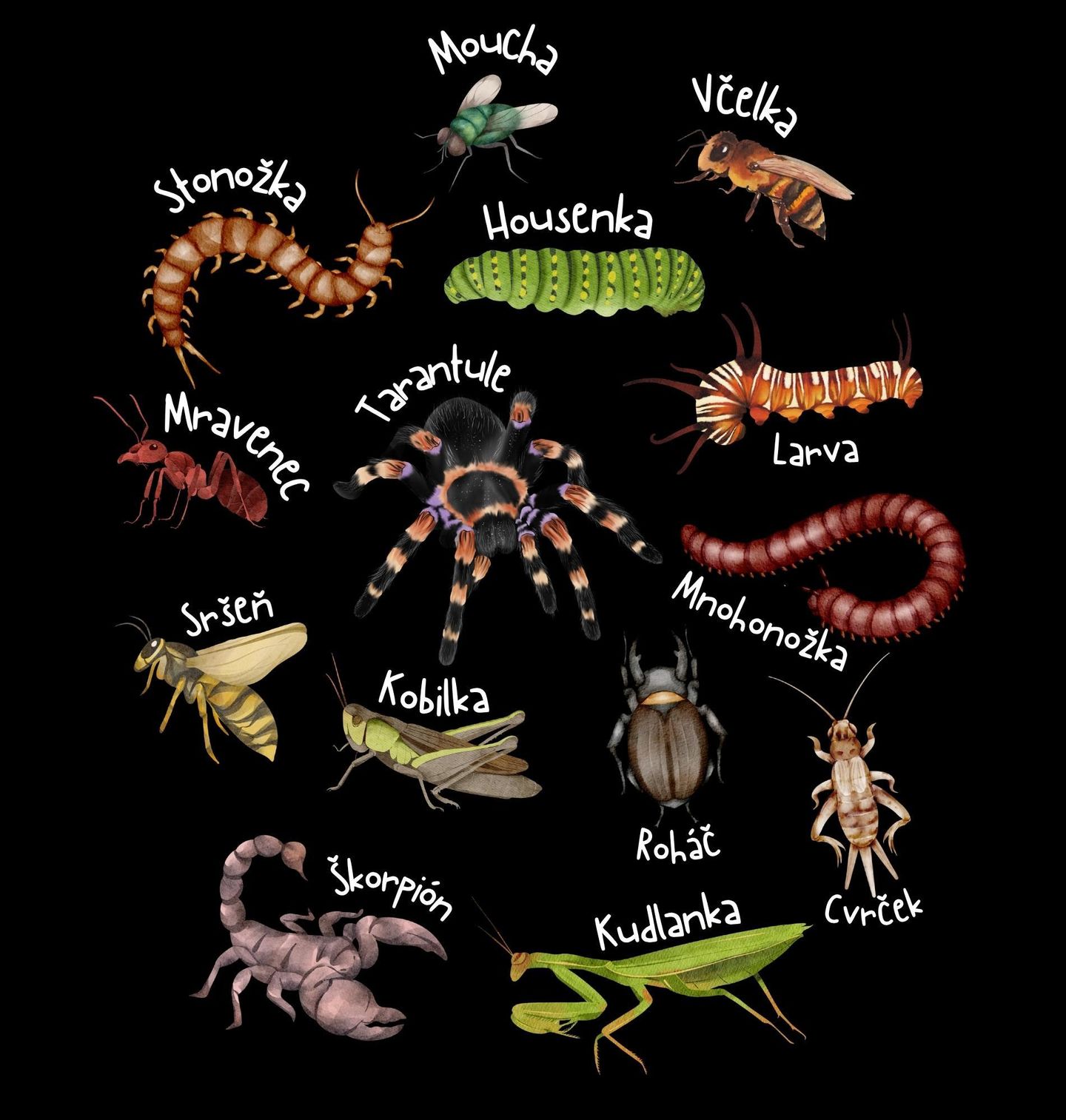 Dětské tričko Druhy Hmyzu. Na motivu najdeš různé druhy hmyzu a živočichů vedle sebe, například: Stonožka, Moucha, Včelka, Housenka, Mravenec, Tarantule, Larva, Mnohonožka, Sršeň, Kobylka, Roháč, Cvrček, Škorpion, Kudlanka. Skvělý jako naučný i veselý motiv pro děti i dospělé.