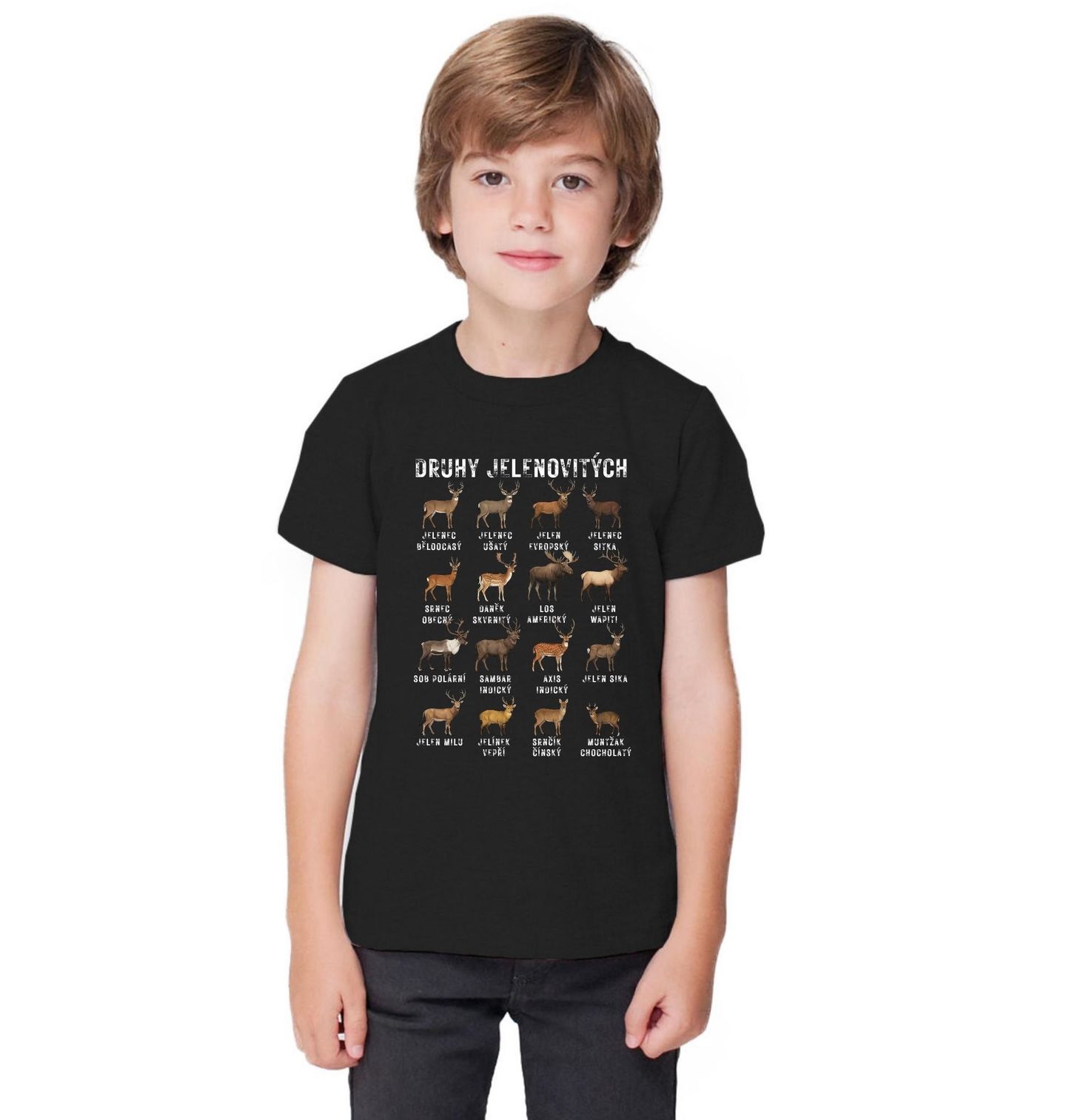 Dětské tričko Druhy Jelenovitých. Na motivu najdeš jednotlivé druhy jelenovitých: Jelenec Běloocasý, Jelenec Ušatý, Jelen Evropský, Jelenec Sitka, Srnec Obecný, Daněk Skvrnitý, Los Americký, Jelen Wapiti, Sob Polární, Sambar Indický, Axis Indický, Jelen Sika, Jelen Milu, Jelínek Vepří, Srnčík Čínský, Muntžak Chocholetý. Perfektní pro každého, kdo miluje zvířata, les nebo je správný myslivec.