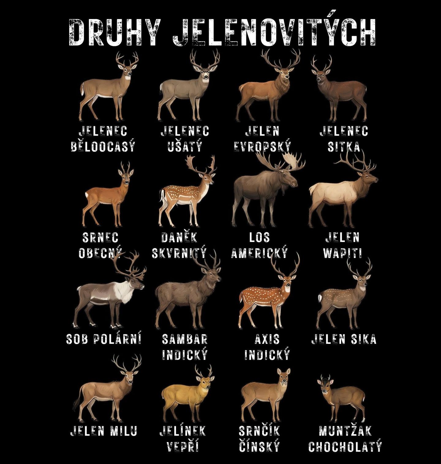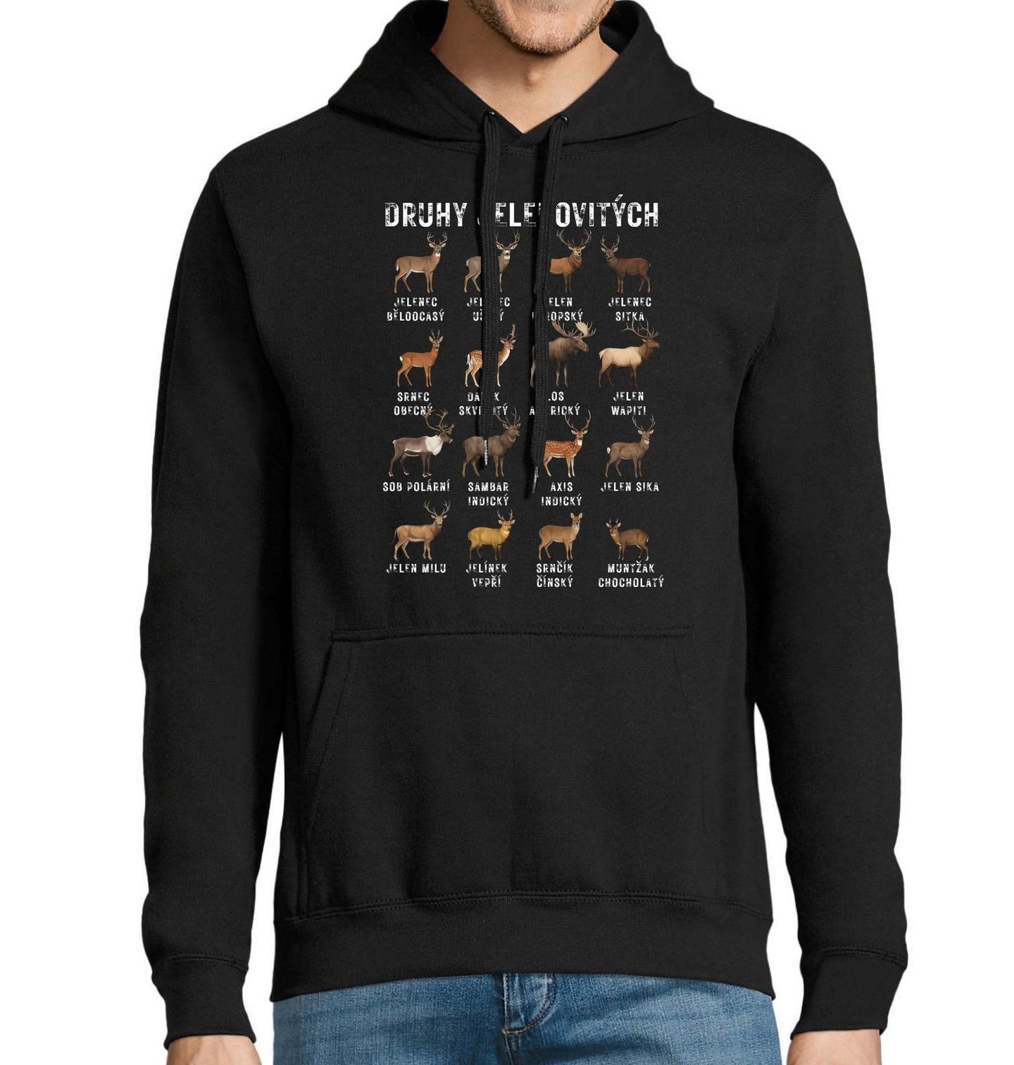 Pánská mikina Druhy Jelenovitých. Na motivu najdeš jednotlivé druhy jelenovitých: Jelenec Běloocasý, Jelenec Ušatý, Jelen Evropský, Jelenec Sitka, Srnec Obecný, Daněk Skvrnitý, Los Americký, Jelen Wapiti, Sob Polární, Sambar Indický, Axis Indický, Jelen Sika, Jelen Milu, Jelínek Vepří, Srnčík Čínský, Muntžak Chocholetý. Perfektní pro každého, kdo miluje zvířata, les nebo je správný myslivec.