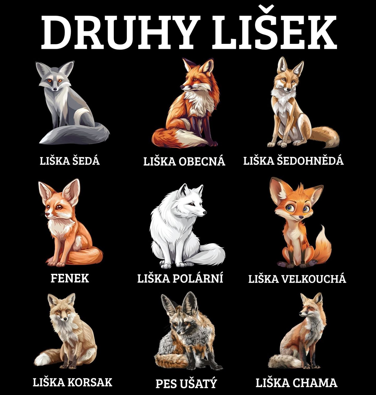 Dětské tričko Druhy Lišek. Každá liška má svůj jedinečný vzhled i prostředí, ve kterém žije, a právě to tento design přehledně a stylově zachycuje. Na motivu najdeš různé druhy, jako je liška šedá, liška obecná, liška šedohnědá, fenek, liška polární, liška velkouchá, liška korsak, pes ušatý a liška chama. Díky detailnímu zpracování si snadno oblíbíš každou liška a poznáš jejich rozdíly.