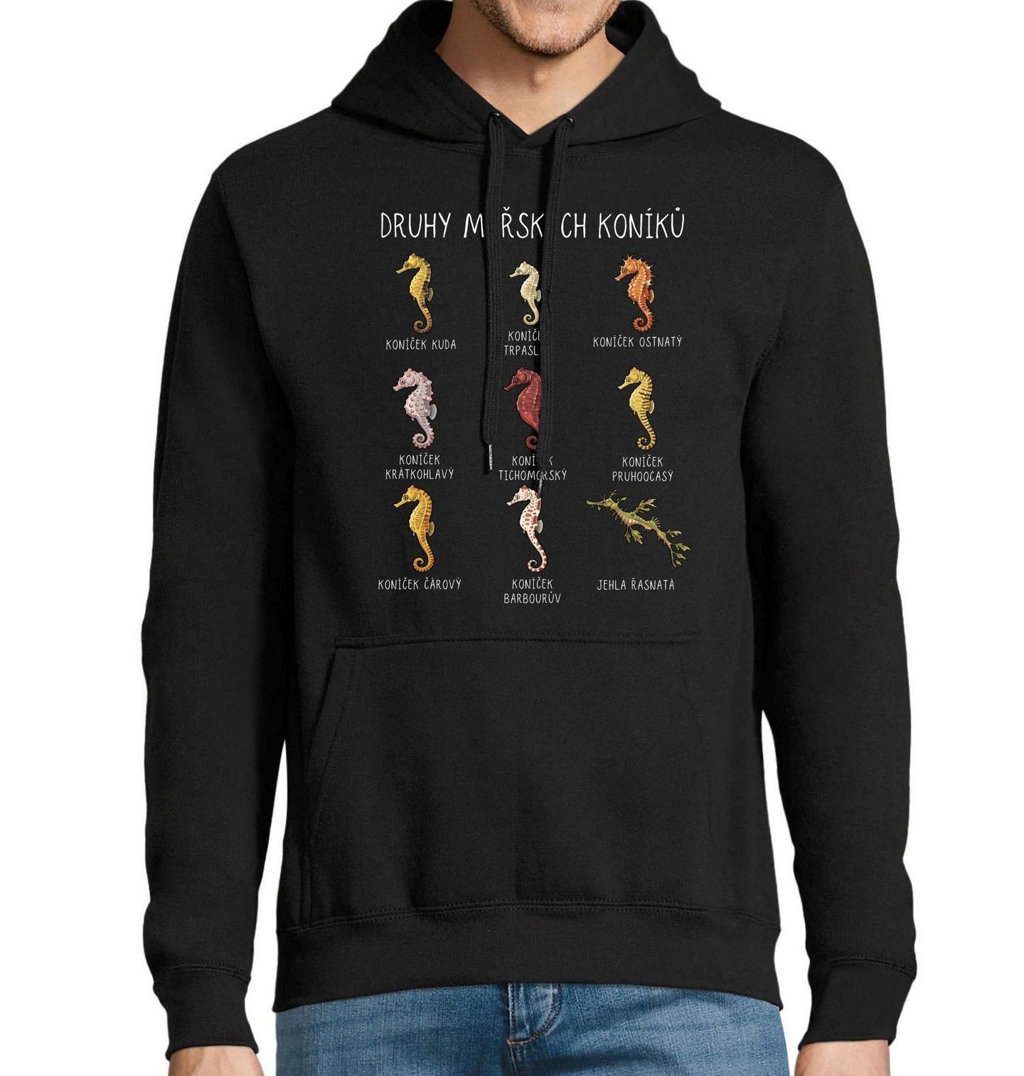 Pánská mikina Druhy Mořských Koníků. Originální motiv „Druhy mořských koníků“, který přehledně ukazuje různé druhy těchto fascinujících tvorů z moře. Na motivu najdeš jednotlivé druhy mořských koníků například: Koníček Kuda, Koníček Trpasličí, Koníček Ostnatý, Koníček Krátkohlavý, Koníček Tichomořský, Koníček Pruhoocasý, Koníček Čárový, Koníček Barbourův, Jehla Řasnatá.