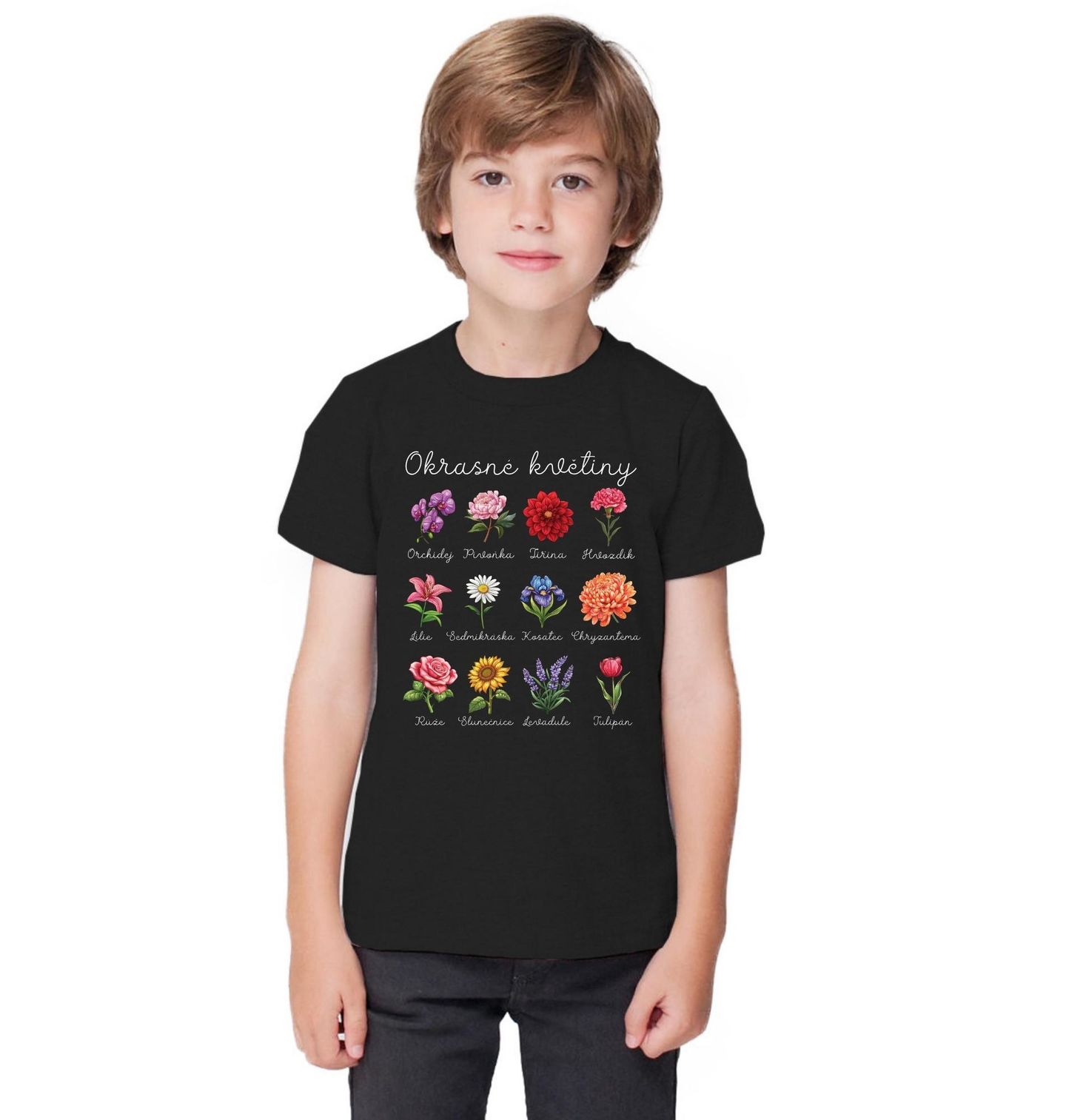Dětské tričko Druhy Okrasných Květin. Na motivu najdeš různé druhy květin vedle sebe, Okrasné Květiny: Orchidej, Pivoňka, Jiřina, Hvozdík, Lilie, Sedmikráska, Kosatec, Chryzantéma, Růže, Slunečnice, Levandule, Tulipán. Ideální pro všechny milovníky květin, zahrady a přírody.