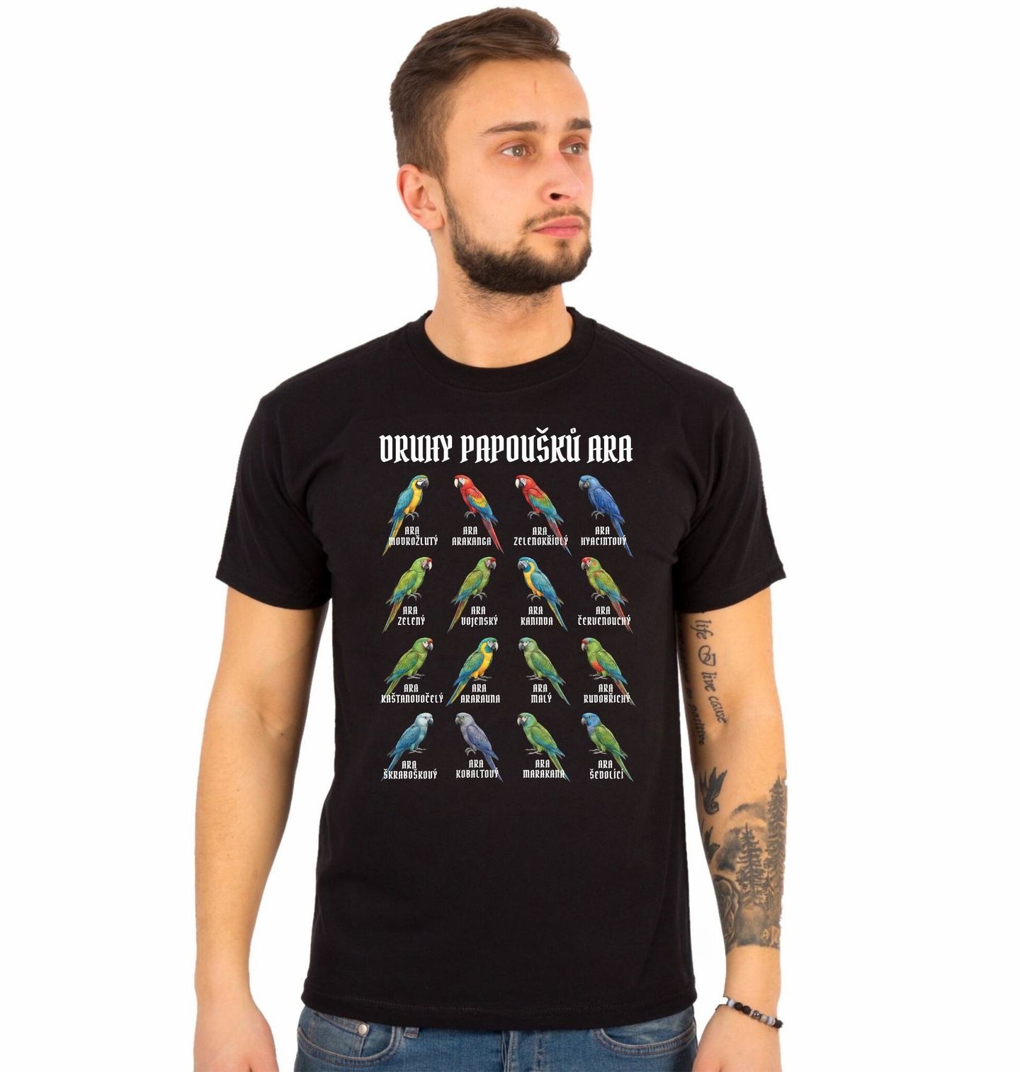 Pánské tričko Druhy papoušků Ara. Ideální pro každého, koho fascinuje papoušek jako inteligentní a výrazný pták. Na motivu najdeš oblíbené druhy papoušků například: Ara modrožlutý, Ara arakanga, Ara zelenokřídlý, Ara hyacintový, Ara zelený, Ara vojenský, Ara kaninda, Ara červenouchý, Ara kaštanovočelý, Ara ararauna, Ara malý, Ara rudobřichý, Ara škraboškový, Ara kobaltový, Ara marakana, Ara šedolící.