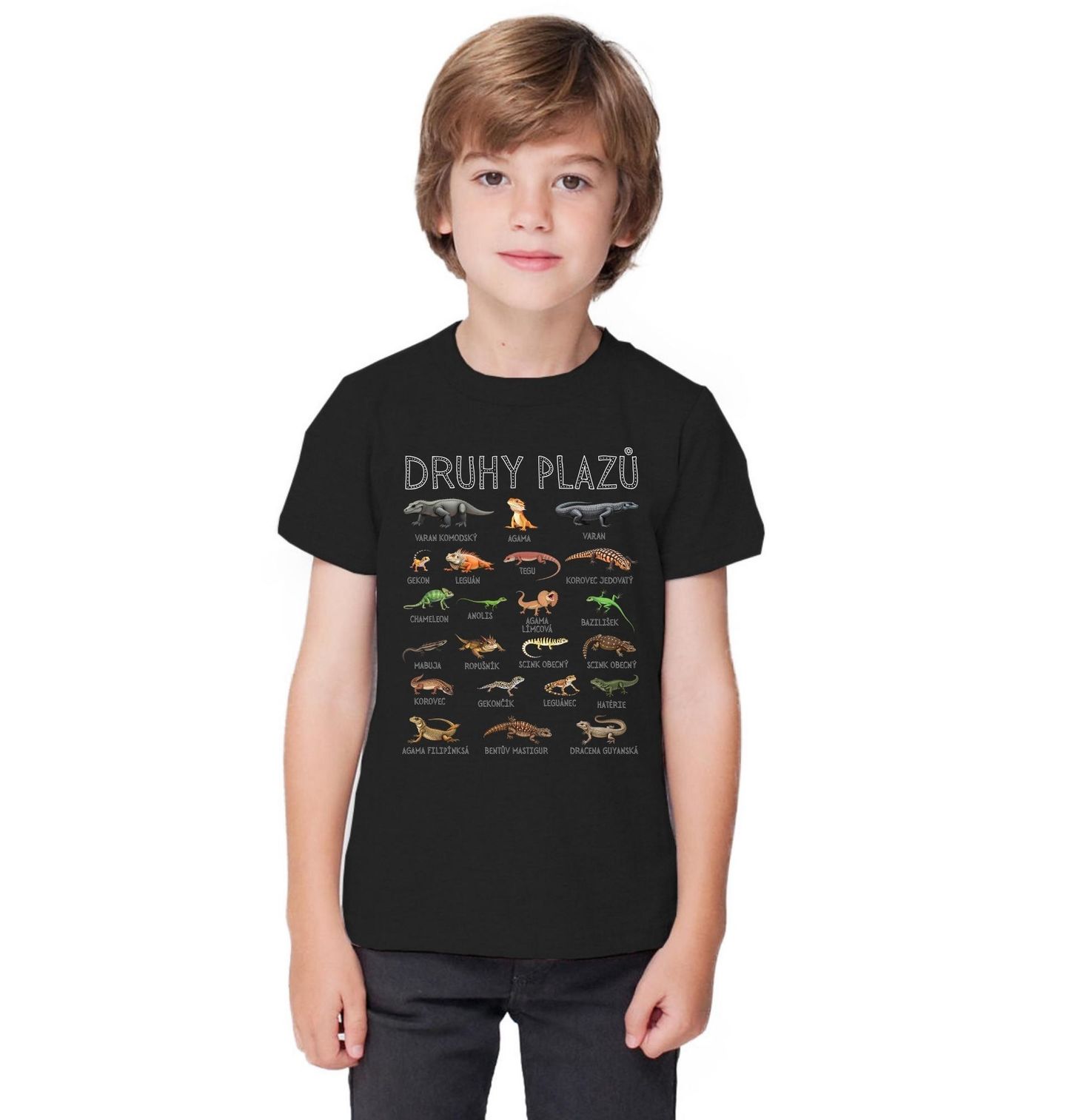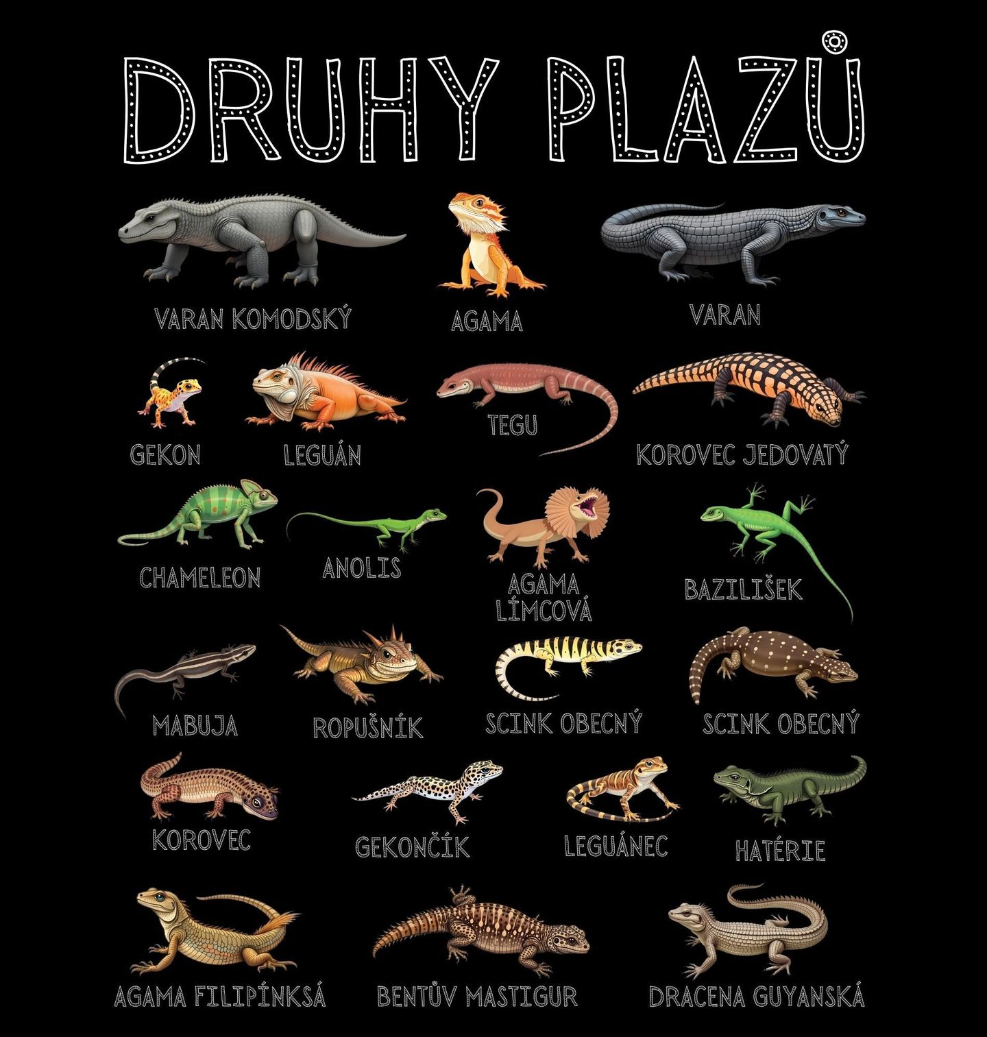 Dětské tričko Druhy Plazů. Perfektní dárek pro milovníky teraristiky, exotických zvířat a přírody. Na motivu najdeš různé druhy plazů například: Varan Komodský, Agama, Varan, Gekon, Leguán, Tegu, Korovec Jedovatý, Chameleon, Anolis, Agama Límcová, Bazilišek, Mabuja, Ropušník, Scink Obecný, Korovec, Gekončík, Leguánek, Hatérie, Agama Filipínská, Bentův Mastigur, Dracéna Guyanská.
