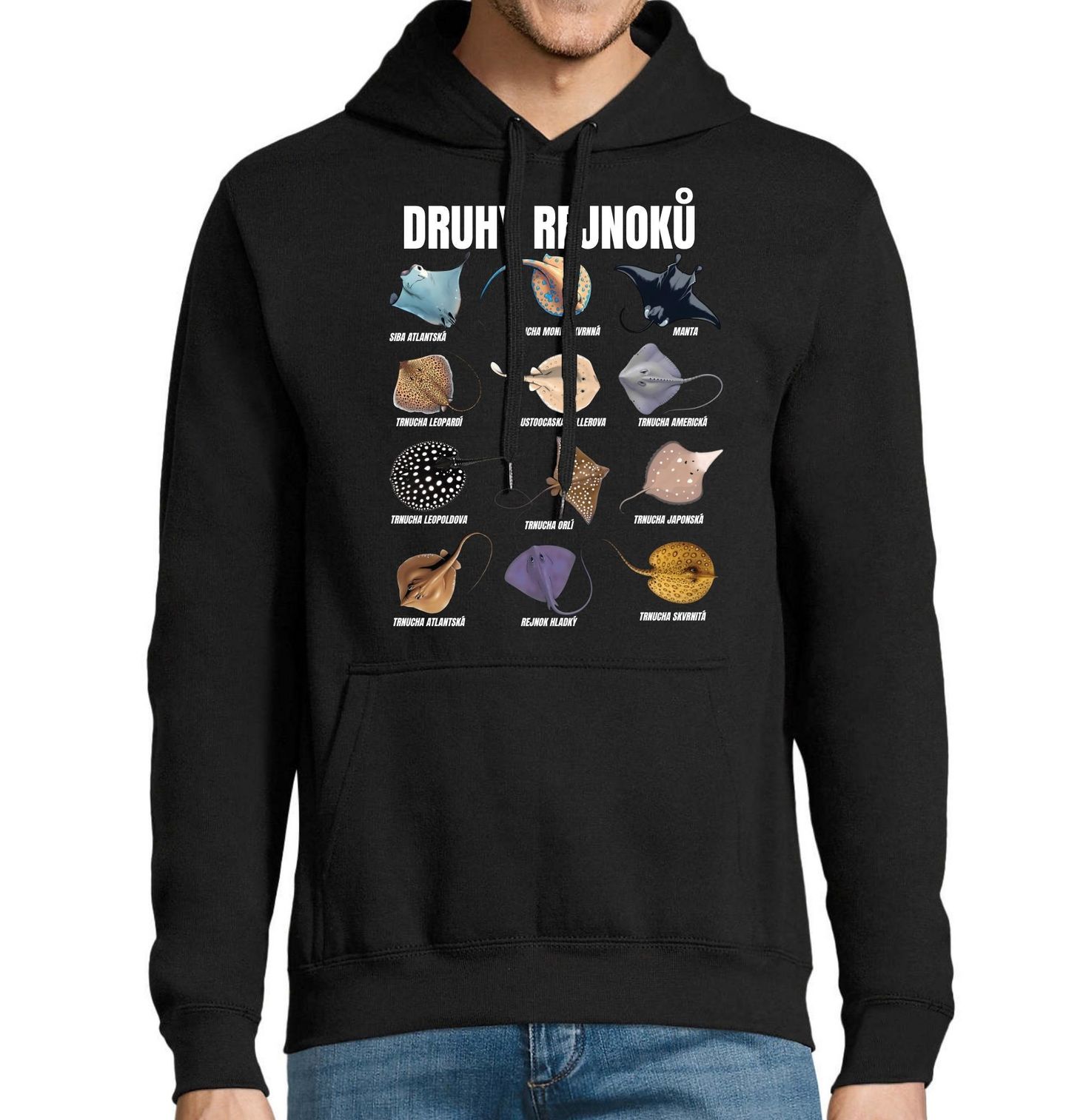 Pánská mikina Druhy Rejnoků. Na motivu najdeš různé druhy jako siba atlantská, trnucha mondoskvrnná, manta, trnucha leopardí, tlustoočka Hallerova, trnucha americká, trnucha Leopoldova, trnucha orlí, trnucha japonská, trnucha atlantská, rejnok hladký a trnucha skvrnitá. Tento přehledný a detailní design potěší všechny milovníky oceánu a podmořského života.