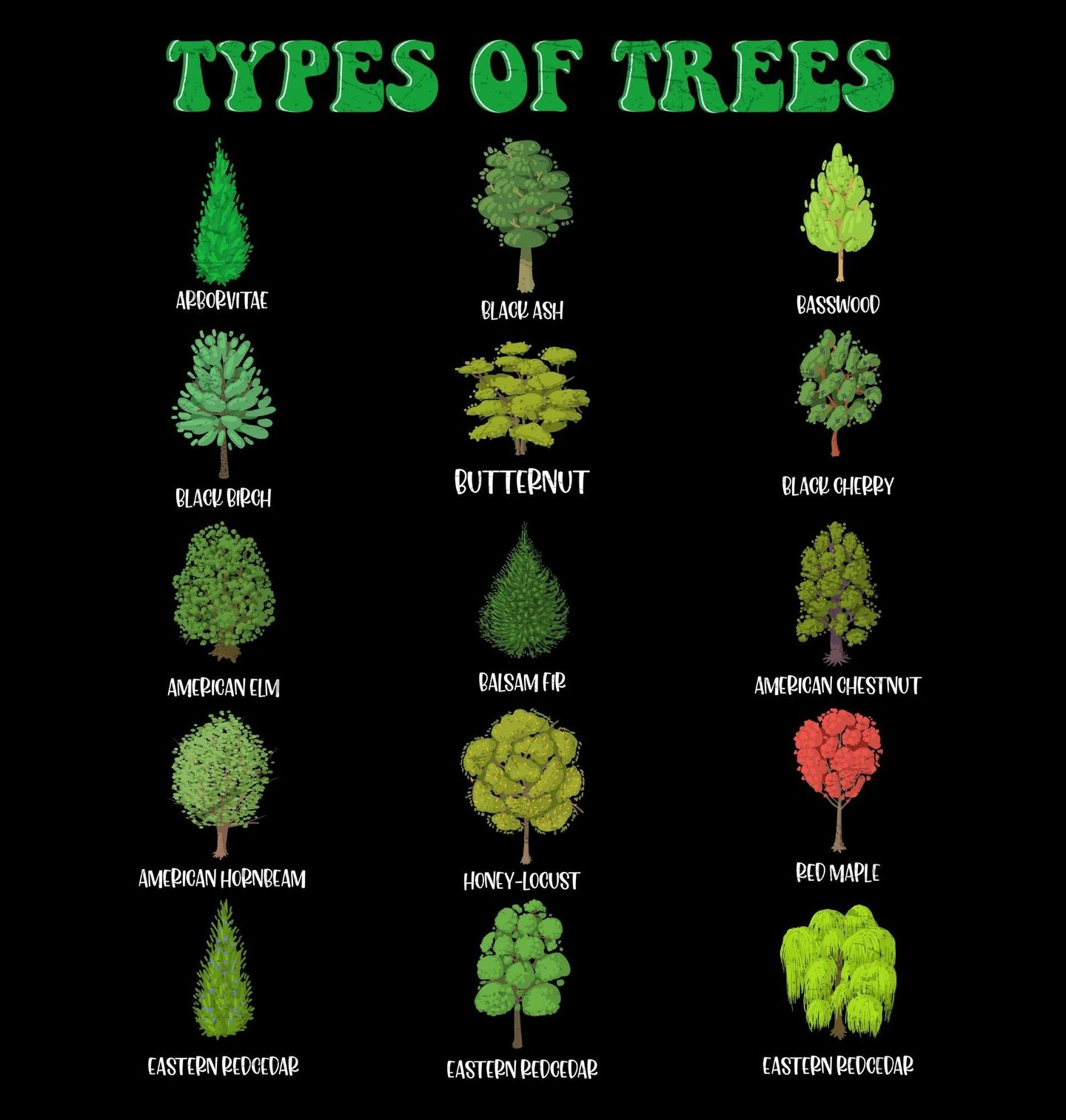 Dámské tričko Druhy Stromů Types of Trees. Tento ilustrovaný motiv představuje strom v mnoha podobách a nabízí přehled různých druhů, které se běžně vyskytují v přírodě. Každý strom je zobrazen stylizovanou ilustrací a doplněn názvem, díky čemuž je motiv nejen dekorativní, ale i edukativní. Motiv je ideální pro milovníky přírody, botaniky a vzdělávání.