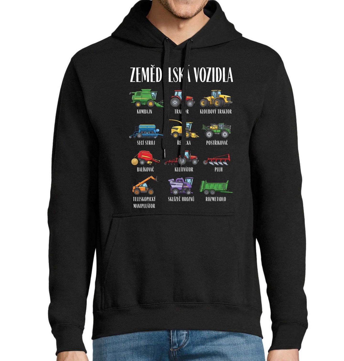 Pánská mikina Druhy Zemědělských Vozidel. Na motivu najdeš zemědělská vozidla vedle sebe, například: Kombajn, Traktor, Kloubový traktor, Secí stroj, Řezačka, Postřikovač, Balíkovač, Kultivátor, Pluh, Teleskopický manipulátor, Sklízeč hroznů, Rozmetadlo. Ideální pro všechny farmáře, milovníky traktorů a velké techniky.