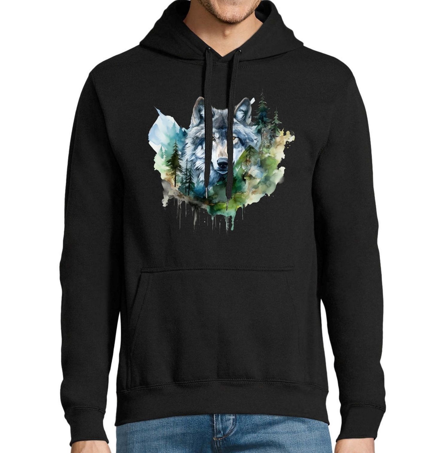 Pánská mikina Duch Vlka šedého v lese. Jemný akvarelový design zachycuje hlavu vlka jako symbol síly a moudrosti, která se tyčí mezi nekonečnými lesy a horami. Ideální volba pro milovníky přírody a dobrodružství.