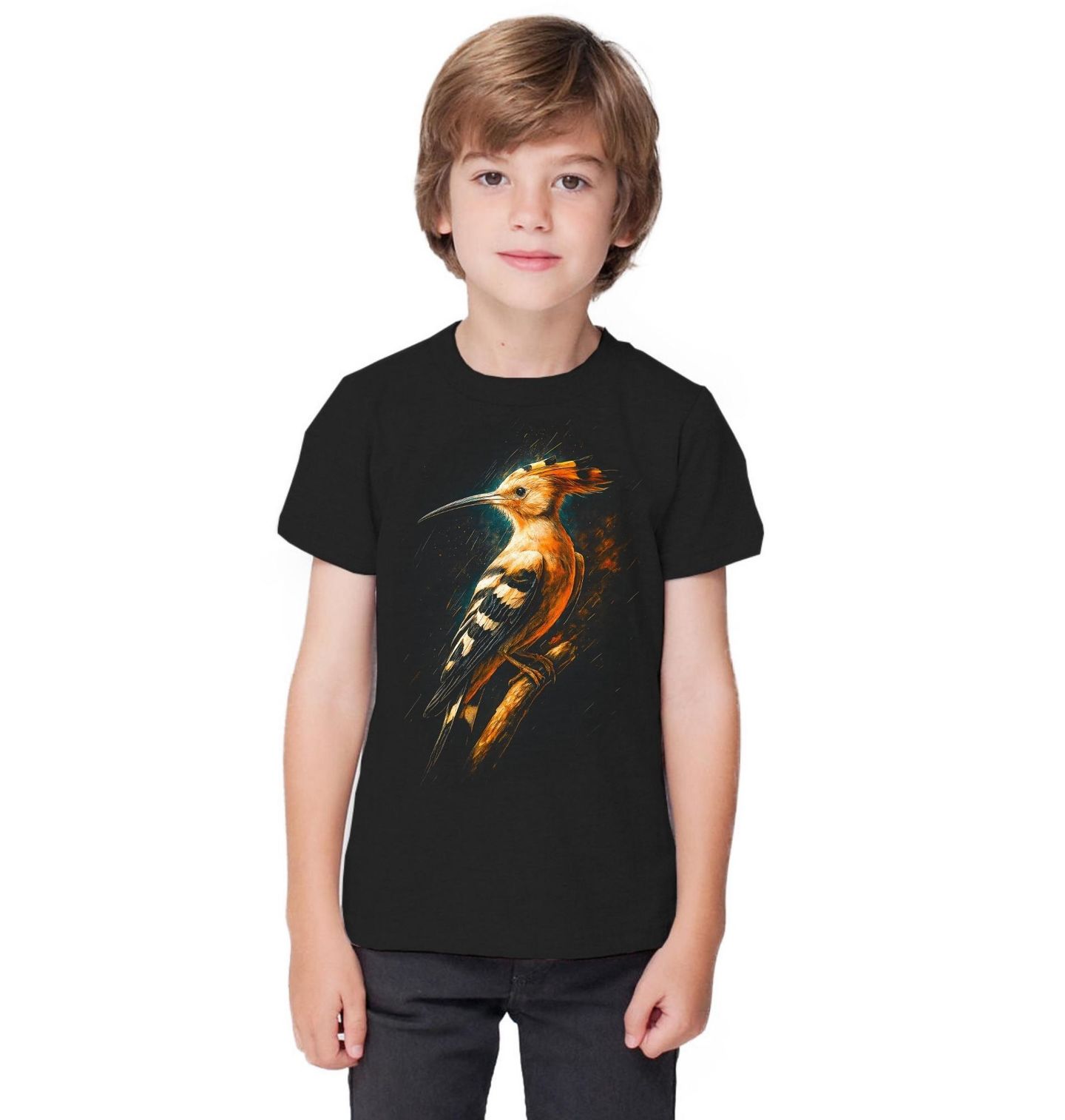 Dětské tričko Dudek chocholatý. Originální ilustrace zachycuje druh dudek chocholatý (Upupa epops), jeden z nejzajímavějších druhů evropského ptactva. Tento pták je snadno rozpoznatelný díky dlouhému zahnutému zobáku a typické oranžové chocholce s černými špičkami. Design působí elegantně a zároveň divoce, takže se hodí pro všechny milovníky přírody i stylového umění.