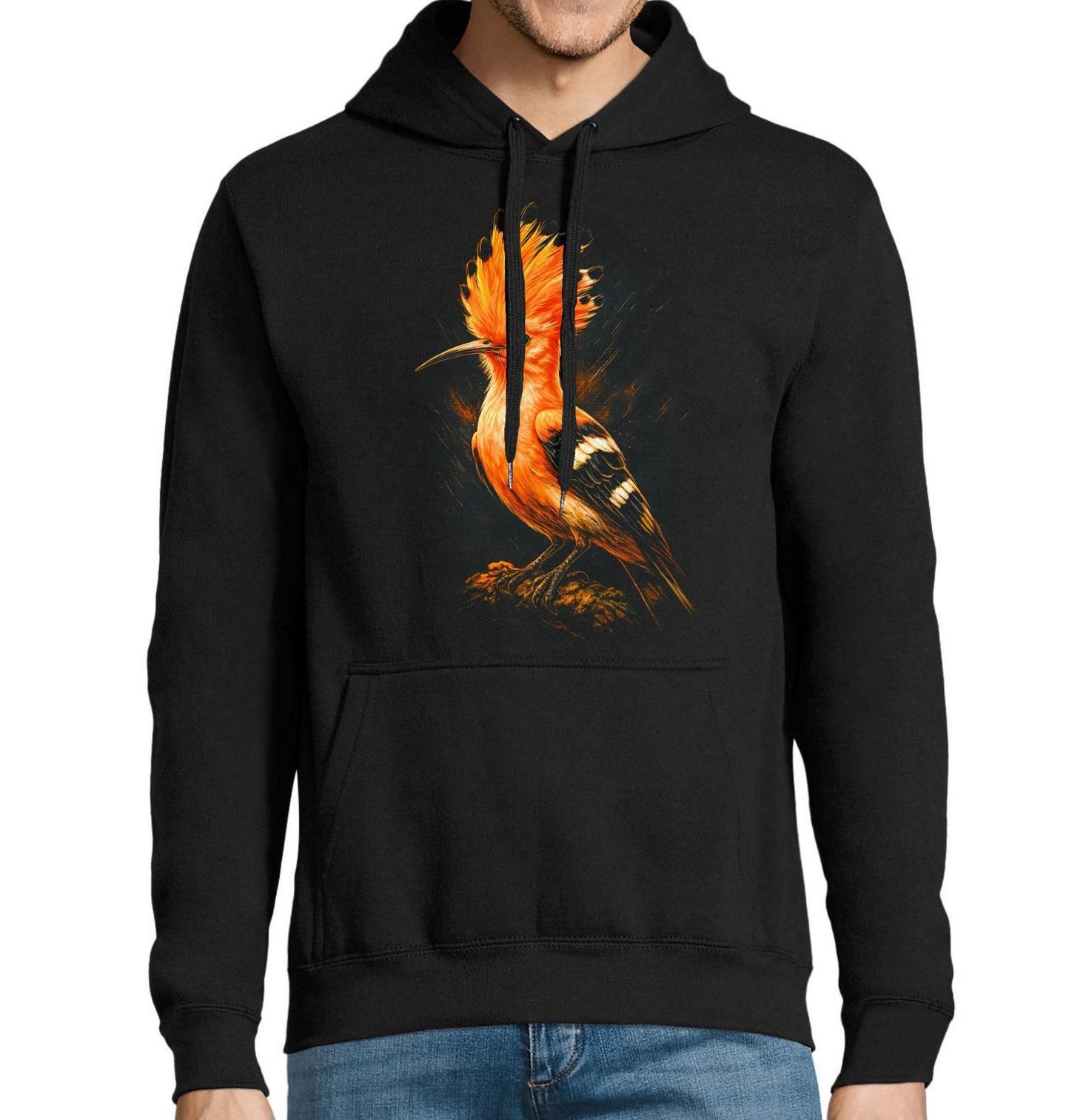 Pánská mikina Dudek chocholatý Hoopoes. Tento originální motiv zachycuje výrazný pták jménem dudek chocholatý (Upupa epops), který je známý svou nápadnou oranžovou chocholkou a kontrastní kresbou křídel. Dudek chocholatý je jeden z nejzajímavějších druhů, které lze v přírodě spatřit, a právě tento pták dodává ilustraci exotický a zároveň přírodní charakter.
