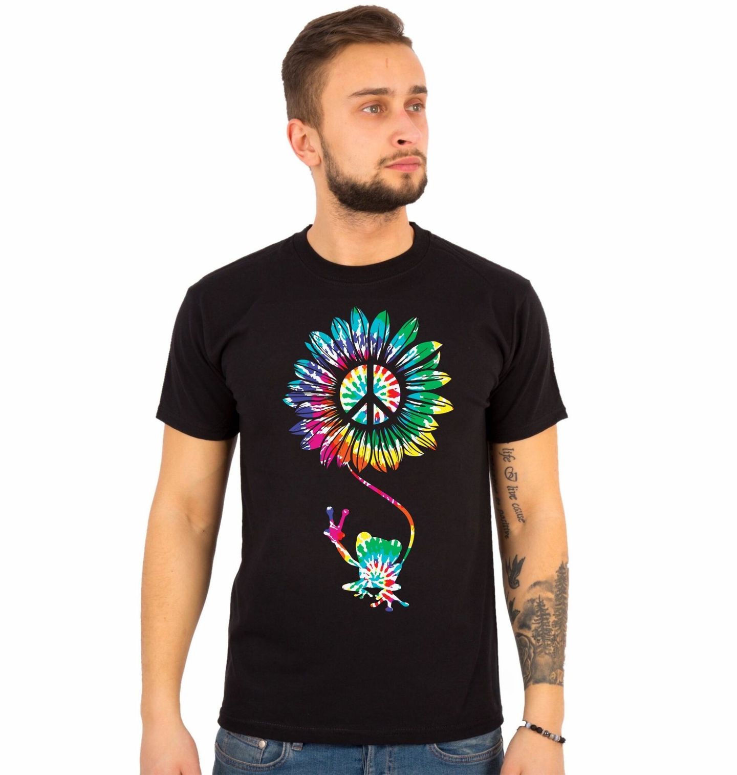 Pánské tričko Duhová Hippie Žába Míru. Tento jedinečný a výrazný motiv spojuje přírodu, svobodu a pozitivní energii do jednoho vizuálně silného designu. Hlavní roli hraje stylizovaná žába, která drží barevnou květinu s ikonickým symbolem pro mír. Kombinace pestrých barev a hippie stylu vytváří originální motiv plný radosti a kreativity.
