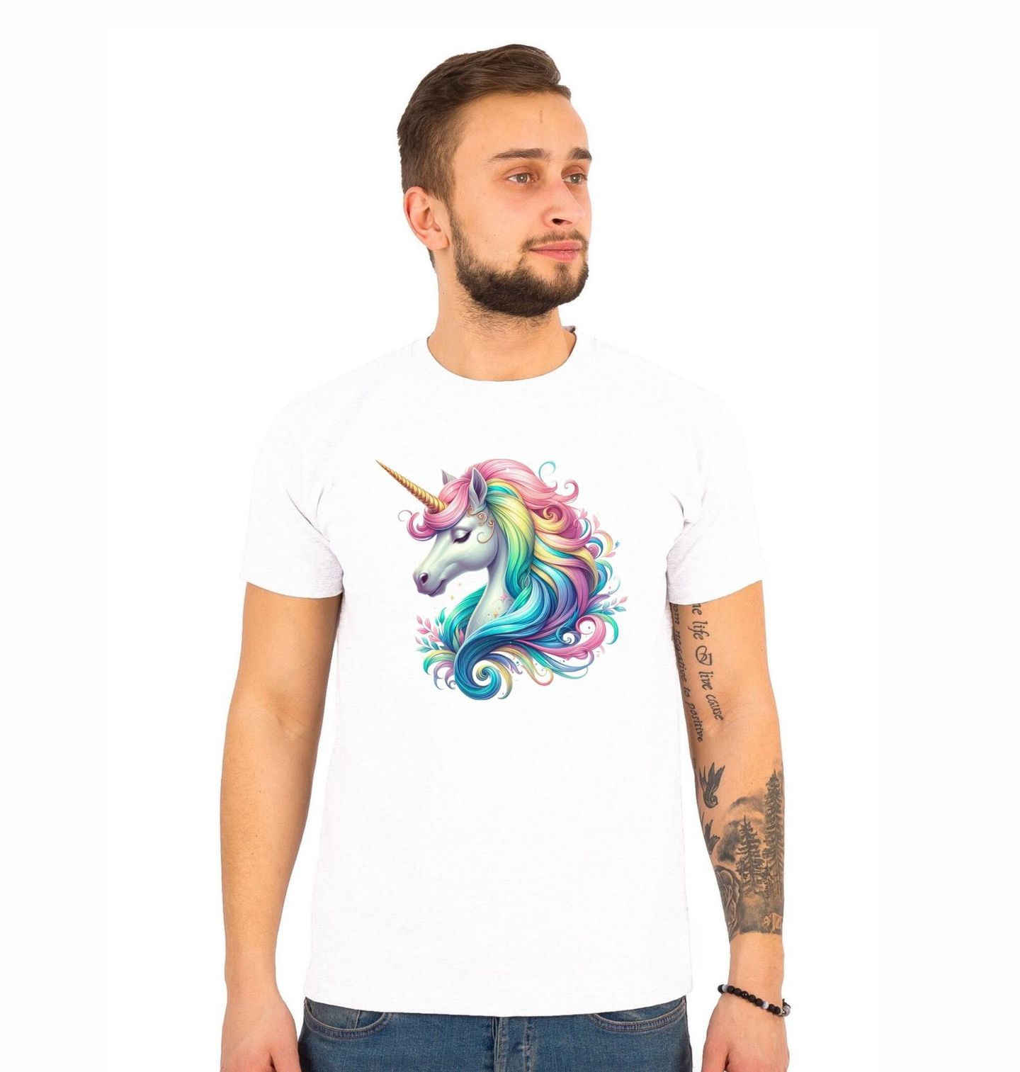 Pánské tričko Duhová Hříva Jednorožce. Objevte kouzelný motiv, který si zamilují děti i dospělí snílci! Tento elegantní jednorožec s nádhernou duhovou hřívou symbolizuje krásu, klid a kouzlo fantazie. Jednorožec v tomto provedení je nejen nádherným výtvarným prvkem, ale také ztělesněním jemnosti, harmonie a kouzelného světa.
