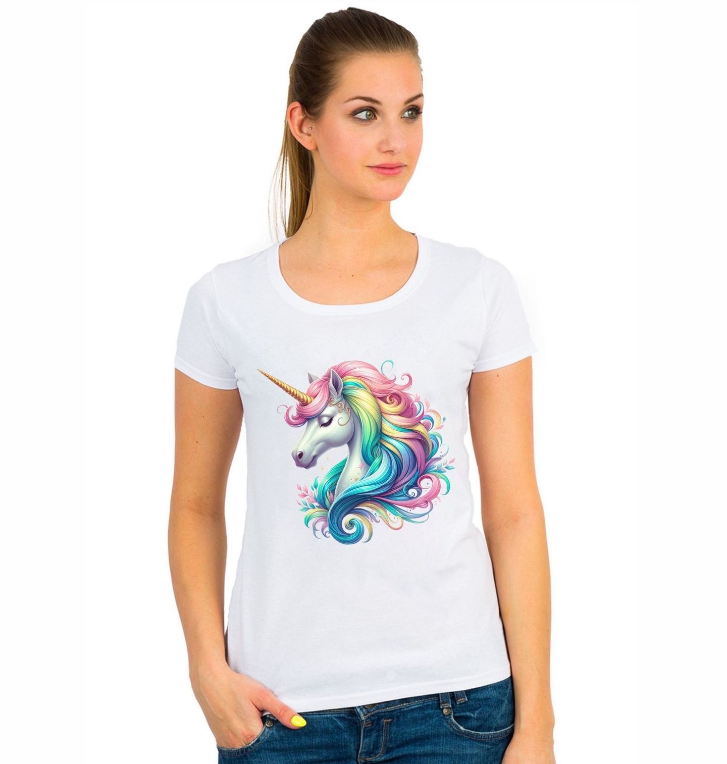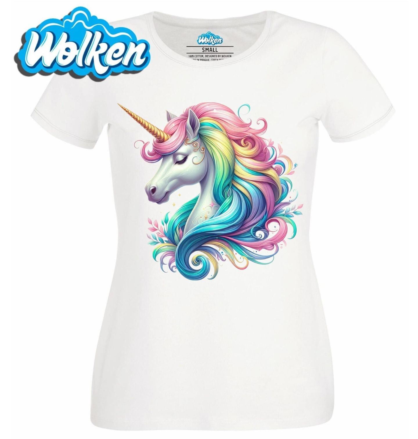 Dámské tričko Duhová Hříva Jednorožce. Objevte kouzelný motiv, který si zamilují děti i dospělí snílci! Tento elegantní jednorožec s nádhernou duhovou hřívou symbolizuje krásu, klid a kouzlo fantazie. Jednorožec v tomto provedení je nejen nádherným výtvarným prvkem, ale také ztělesněním jemnosti, harmonie a kouzelného světa.