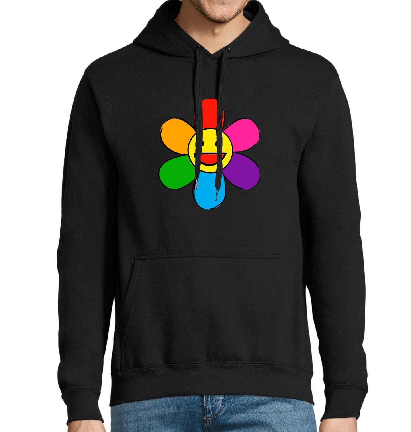 Pánská mikina Duhová Květina Emoji. Tahle květina viděla slunce, prošla duhou a narazila na emoji smajlíka – a to všechno najednou! Výsledkem je neodolatelný výbuch barev, radosti a trošky šílenství. Ideální triko pro všechny, co se nebojí usmívat na svět jako sluníčko.