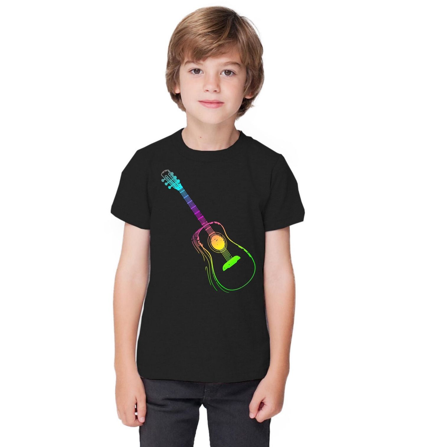 Dětské tričko Duhová Kytara. Stylová duha v rytmu hudby! Tento motiv spojuje barevný proud energie a lásku k hudbě v jednom. Kytara je hlavním symbolem svobody, kreativity a emocí – a zde je zobrazena v pestrobarevném duhovém designu, který zaujme na první pohled.