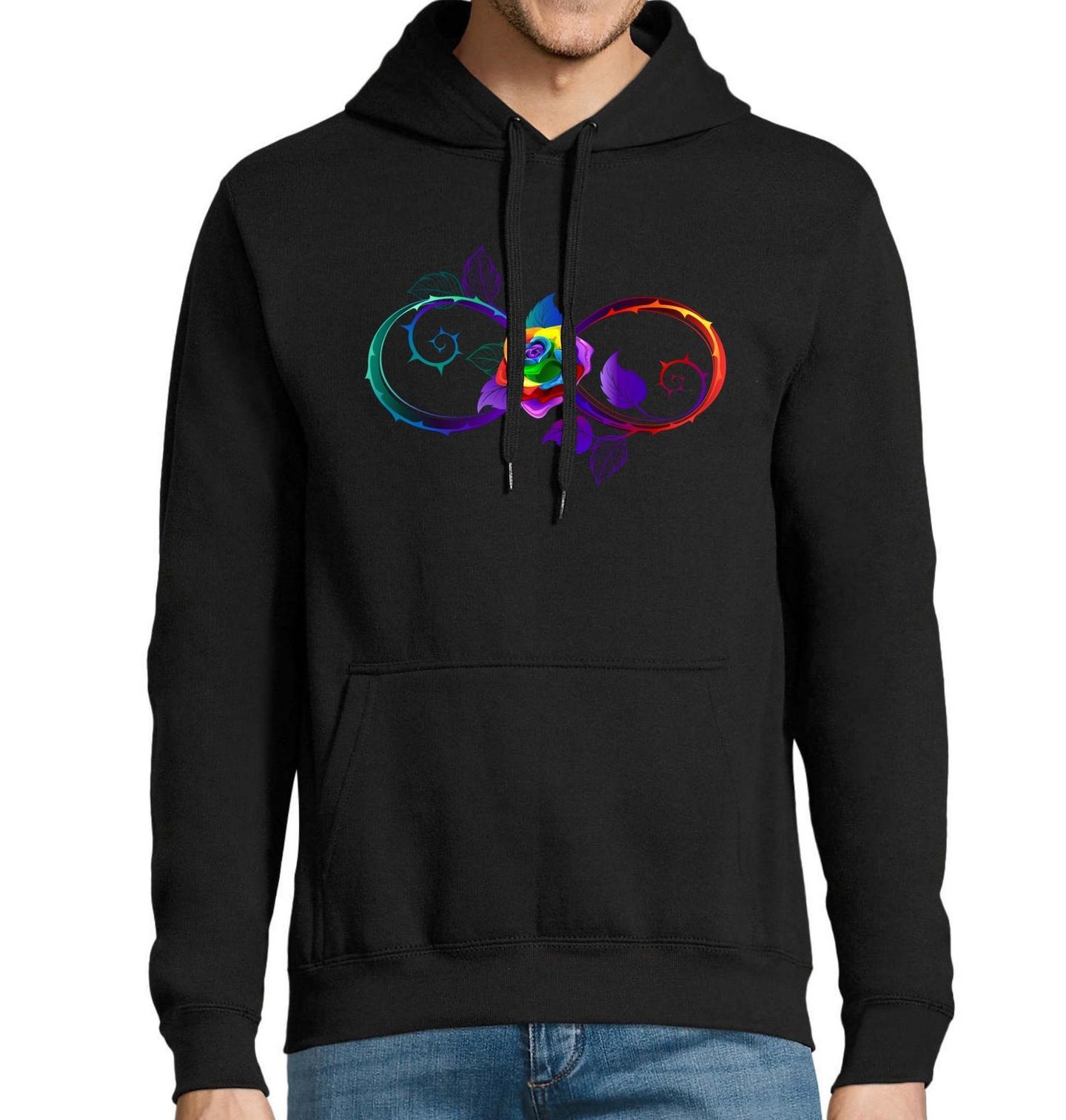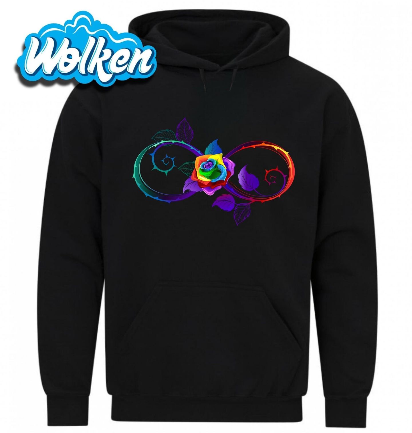 Pánská mikina Duhová Růže Nekonečna Navždy. Duhová růže symbolizuje rozmanitost, lásku a odvahu, zatímco elegantní tvar nekonečno ji objímá jako připomínku, že krása a cit mohou trvat navždy. Motiv je plný emocí a hlubokého významu – ideální pro ty, kteří chtějí nosit styl, co má duši.