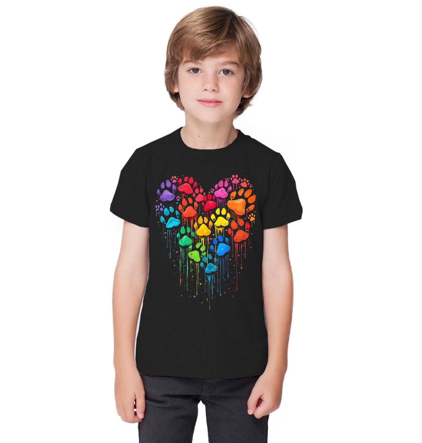 Dětské tričko Barevné Srdce z Tlapek. Tento originální potisk spojuje srdce, barvy a psí tlapky do jednoho výjimečného motivu, který si zamiluje každý hrdý pejskař. Ať už je tvůj pes malý nebo velký, černý nebo zrzavý, jedno je jisté – patří do tvého srdce.