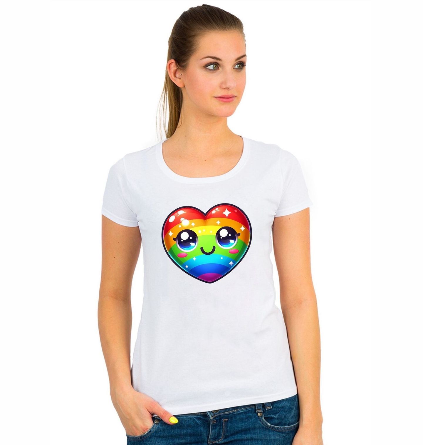 Dámské tričko Duhové Srdíčko. Roztomilé duhové srdce s veselým výrazem přináší radost, optimismus a pozitivní energii na první pohled. Tento hravý motiv symbolizuje láska bez hranic, otevřenost a dobrou náladu, která se snadno přenáší na každého kolem. Skvělá volba nejen na Valentýn.