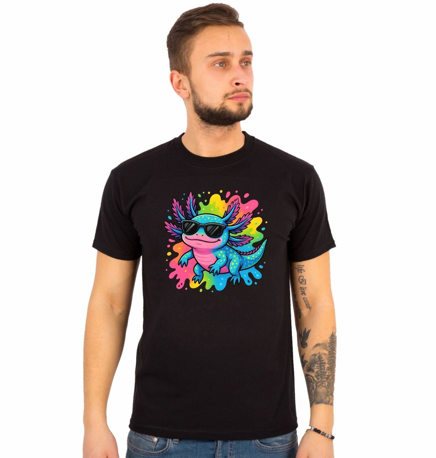 Pánské tričko Duhový Axolotl v Brýlích. Tenhle parádní motiv zachycuje barevného tvorečka jménem axolotl, který si užívá pohodu v tmavých slunečních brýlích na pozadí duhových barevných cákanců. Veselé barvy, úsměv a ležérní styl dělají z motivů s axolotlem perfektní volbu pro všechny, kdo milují roztomilá zvířátka a hravý design.