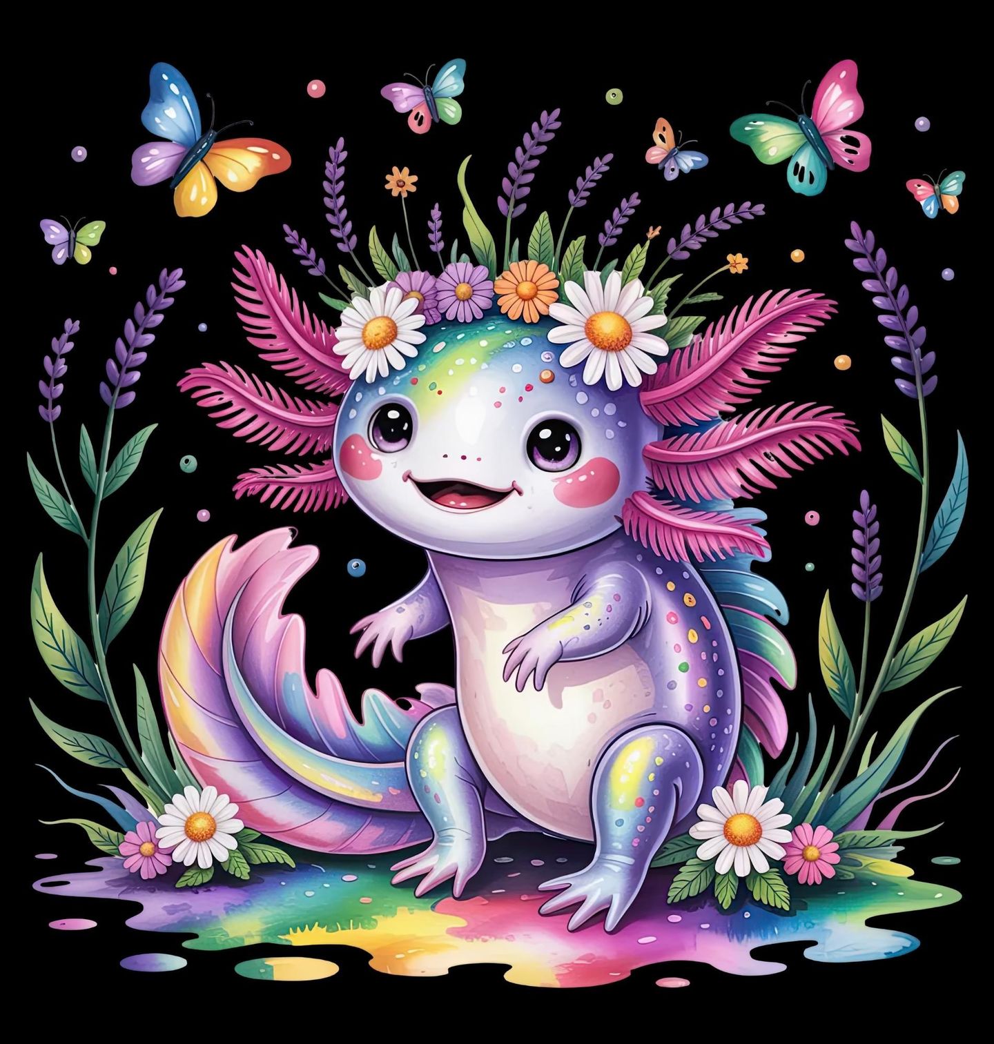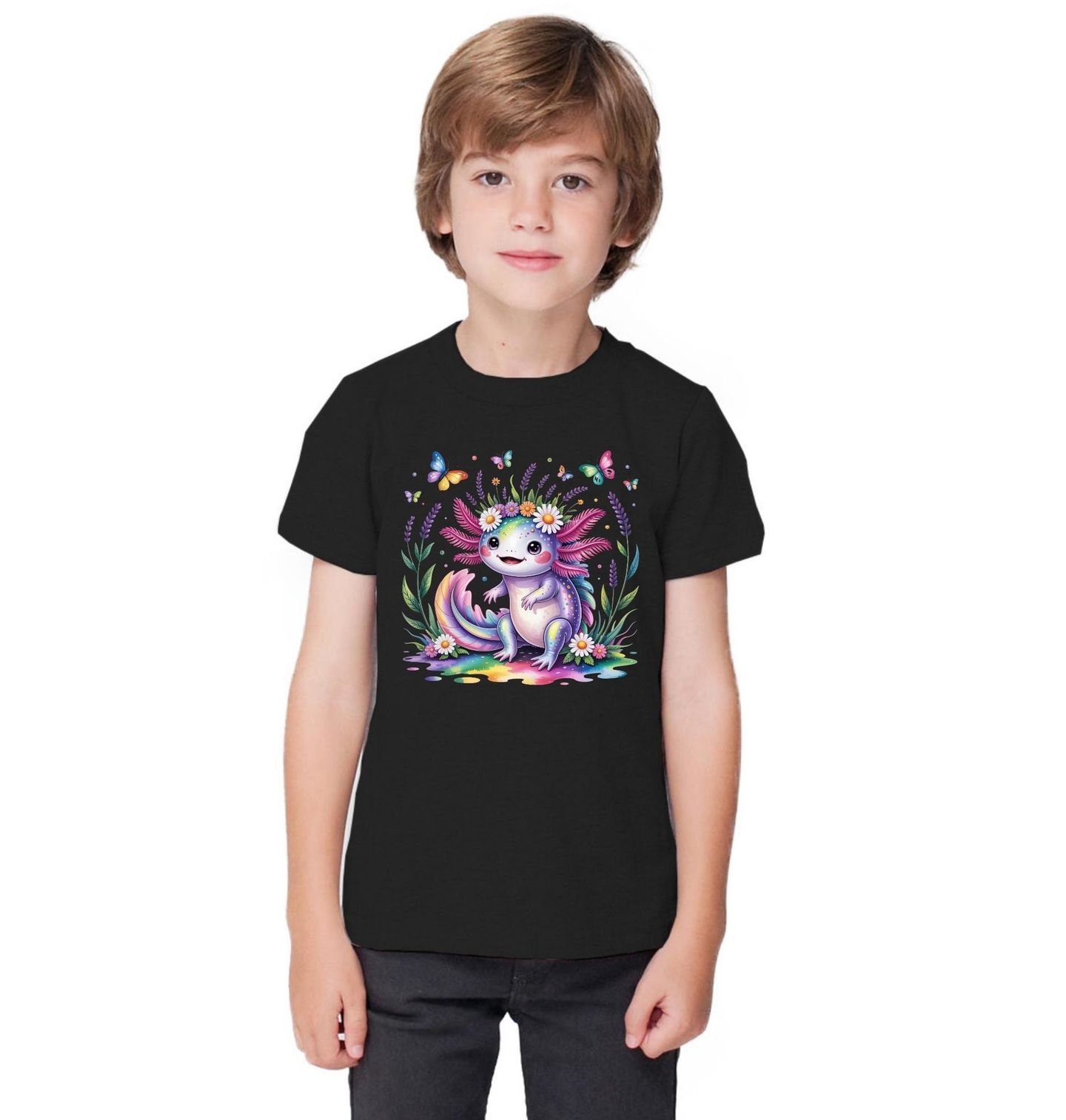 Dětské tričko Duhový Axolotl v Říši Motýlů a Květin. Roztomilý duhový axolotl s květinovou čelenkou sedí uprostřed magické zahrady. Kolem něj poletuje barevný motýl za motýlem a všude kolem rozkvétají jemné květiny v pastelových barvách. Celý motiv působí jemně, hravě a pohádkově - ideální pro všechny, kdo milují roztomilá zvířátka, přírodu a pozitivní energii.