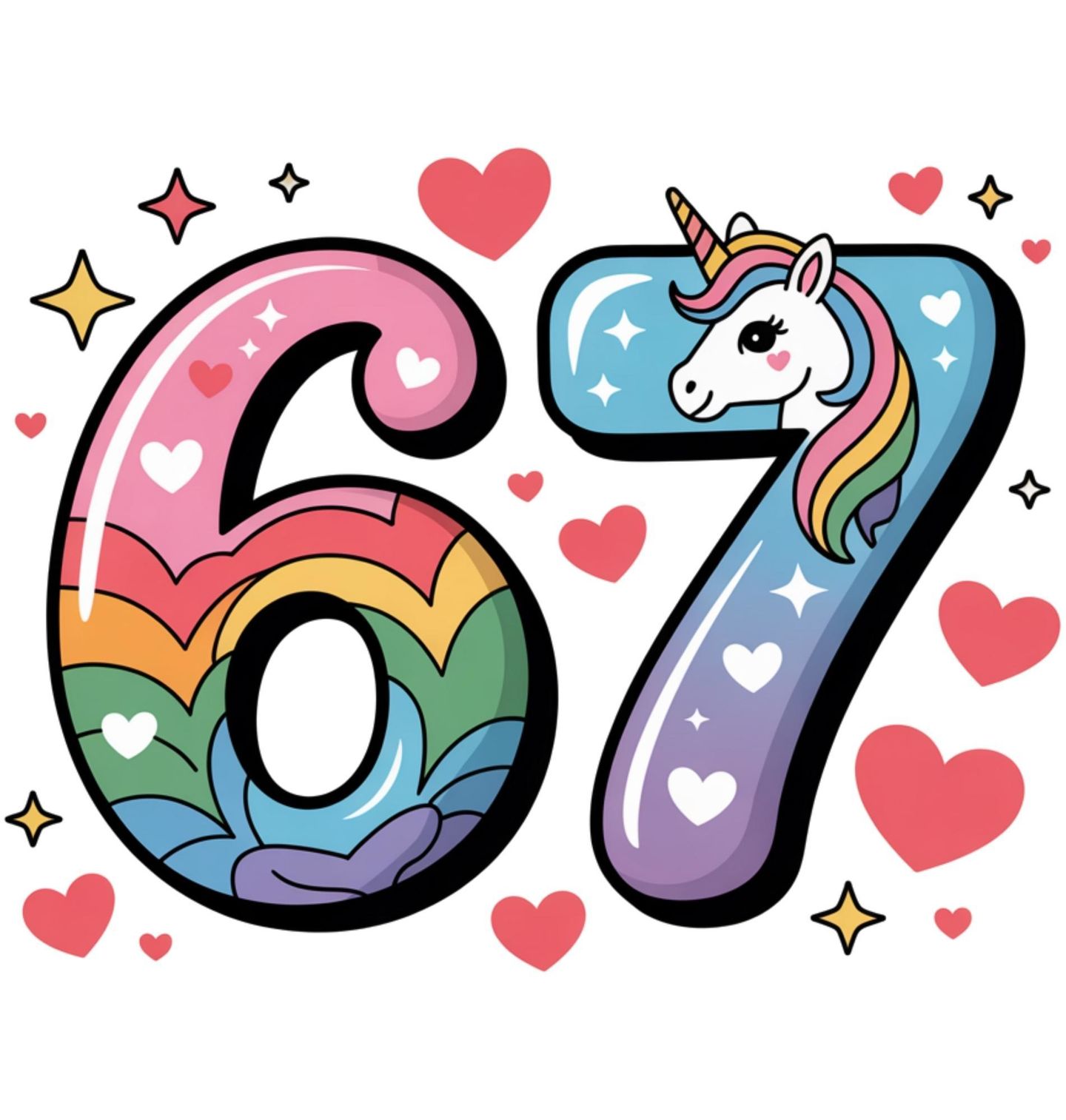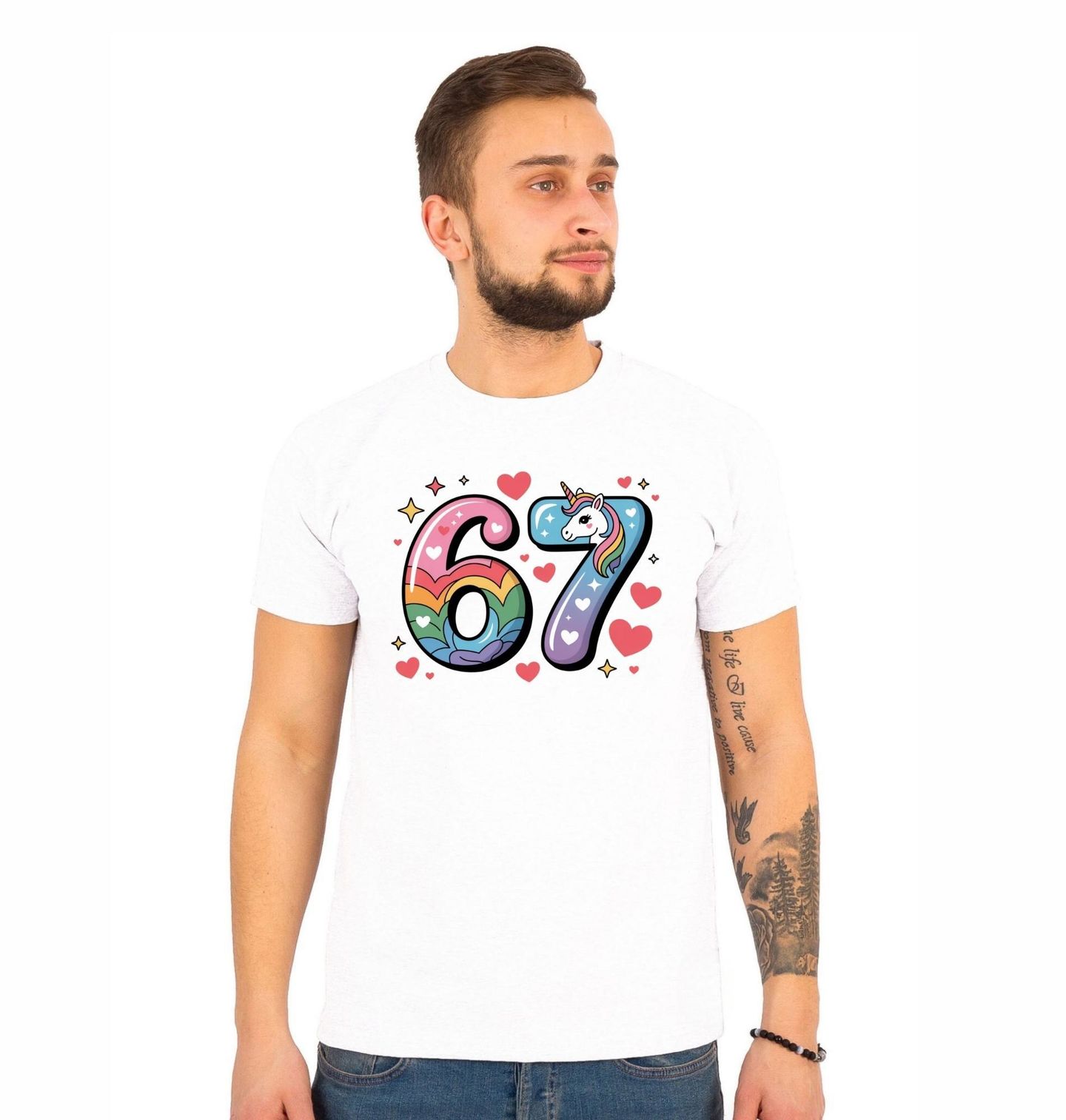 Pánské tričko Duhový Jednorožec 67 Six Seven Meme. Roztomilý a barevný motiv 67 pro všechny, kdo milují pohádky, duhy a kouzelné bytosti. Číslo 67 je zde zpracované v hravém stylu s duhovými barvami, srdíčky a roztomilým motivem jednorožec. Ideální jako dárek pro děti, teenagery i dospělé, kteří se rádi smějí a milují originální meme motivy.