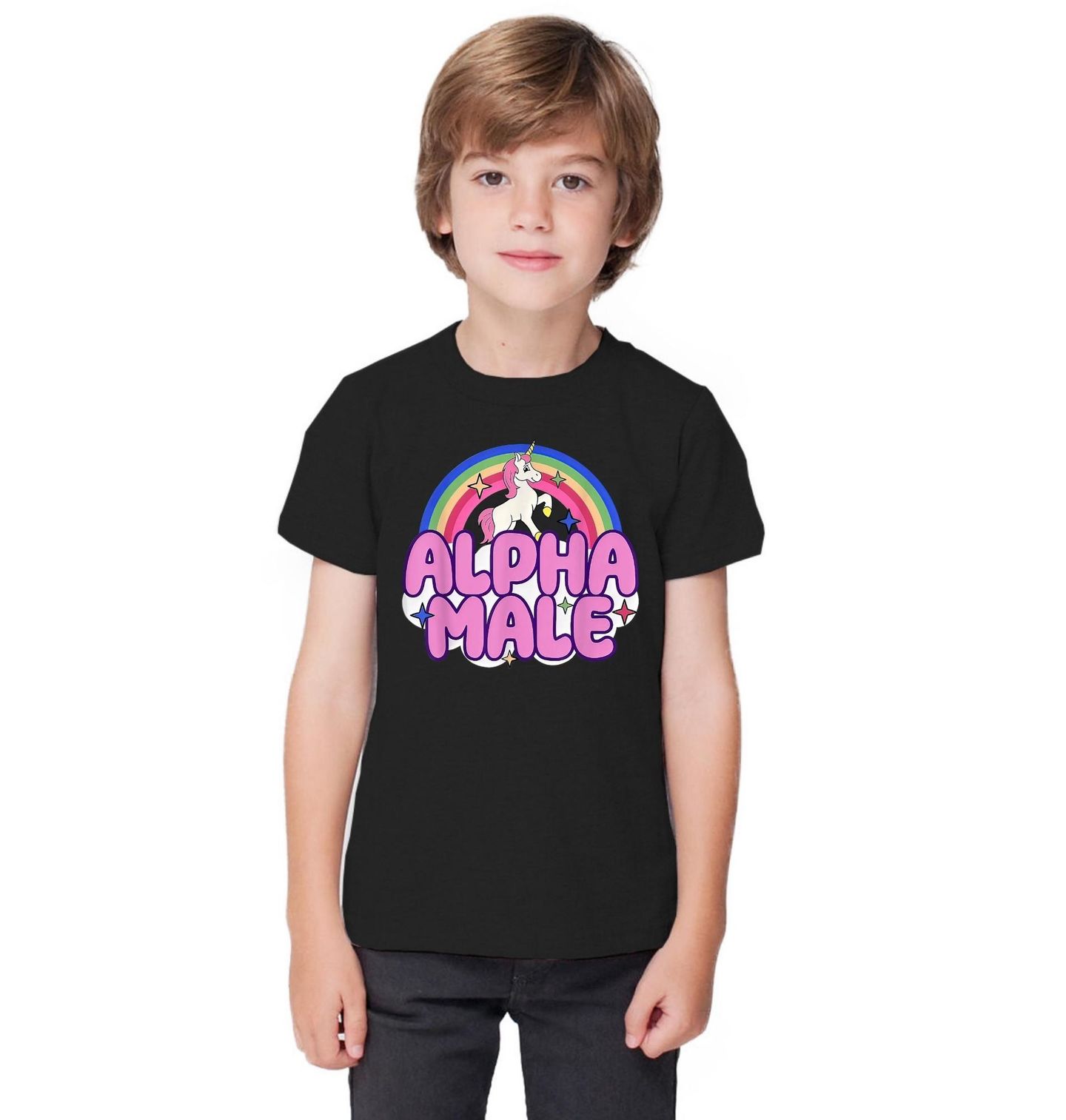 Dětské tričko Duhový Jednorožec Alpha Male. Stylový a vtipný design, kde hlavní roli hraje roztomilý jednorožec pod duhou, doplněný nápisem „ALPHA MALE“ – tedy „alfa samec“. Kontrast mezi jemným, pohádkovým motivem a odvážným textem vytváří skvělý humor, který si užijí jak muži, tak ženy s nadhledem.