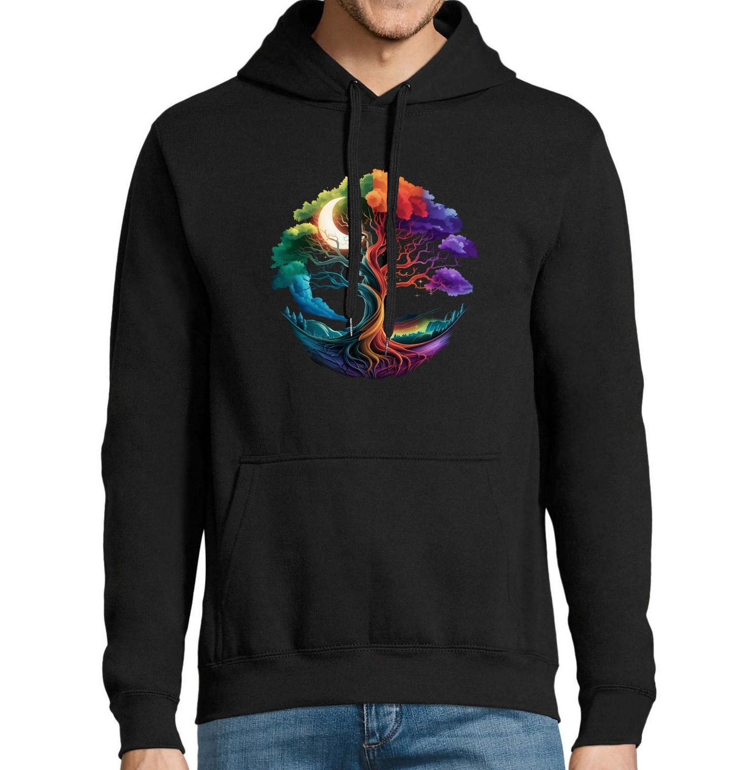Pánská mikina Duhový Strom Věčnosti. Barevný a zářivý strom, který reprezentuje věčnost, jednotu a světlo měsíce. Každý odstín listí je jako kapitola v příběhu života. Tento motiv v sobě nese kouzlo, spiritualitu i naději. Ideální pro ty, kdo věří, že strom je víc než jen dřevo – je to posvátný symbol bytí.