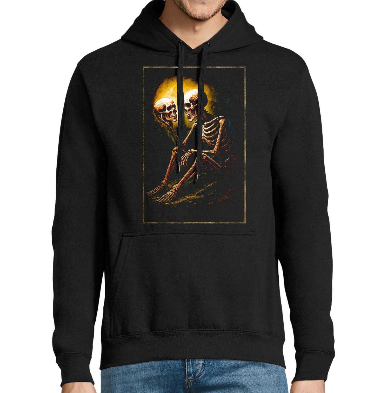 Pánská mikina Dvě Tváře Smrti. Silný a symbolický motiv zobrazuje scénu, kde kostlivec drží lebka a hledí jí do očí, jako by vedl tichý dialog sám se sebou. Tento design v sobě nese hlubší myšlenku o životě, smrti a vnitřním zamyšlení. Motiv kostlivec lebka zaujme nejen svým detailním zpracováním, ale i atmosférou plnou tajemství a filozofie. Kontrast světla a stínu dodává ilustraci dramatický efekt, který podtrhuje celkový dojem.
