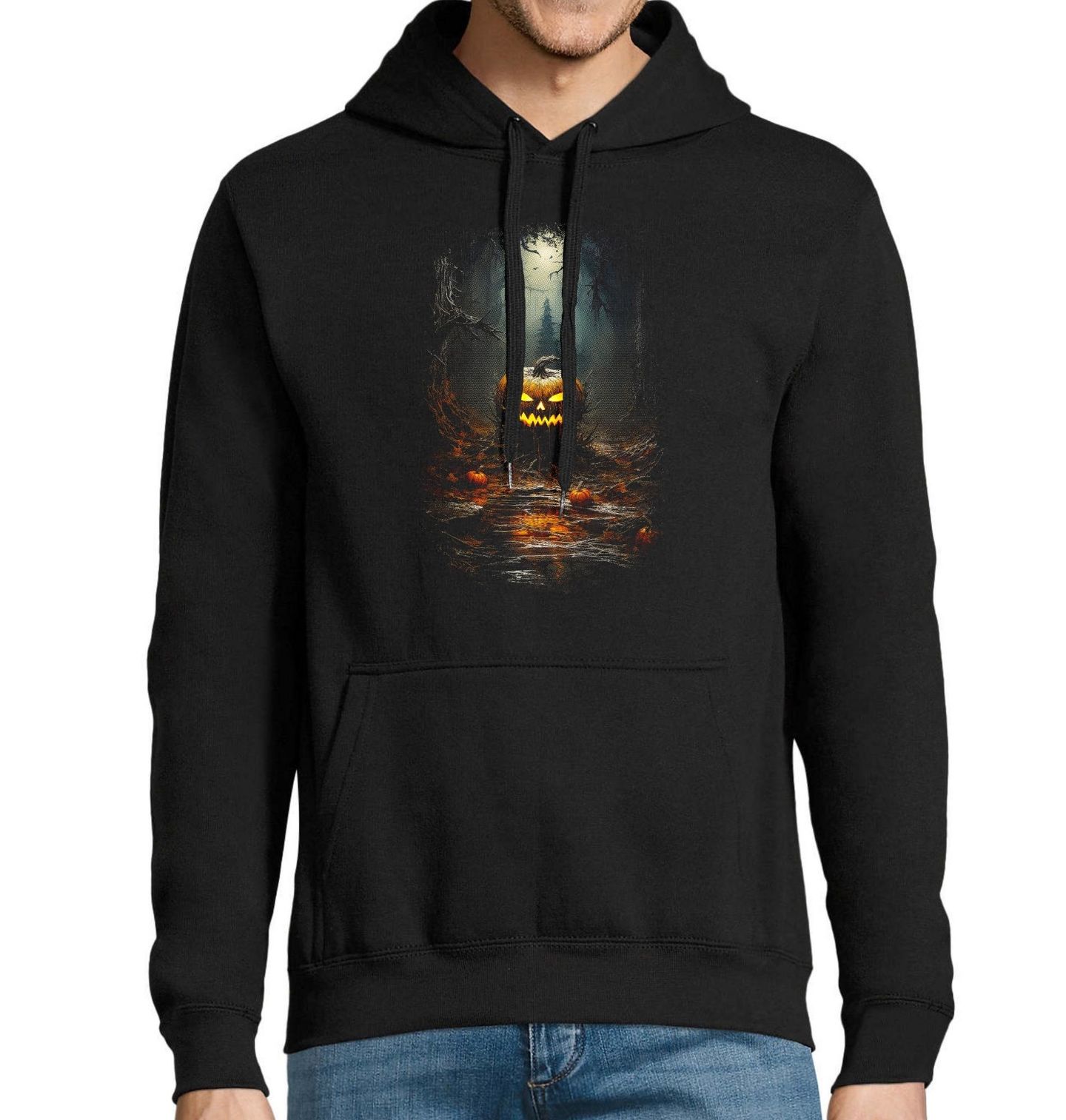 Pánská mikina Dýně v Halloweenském Lese. Typická halloweenská dýně s děsivým výrazem uprostřed temného lesa, kde se ztrácí světlo i klid. Její rozžhavený pohled a zubatý úsměv vynikají v kontrastu s ponurým prostředím plným stínů. Ideální motiv pro milovníky hororu, podzimního tajemna a Halloweenu.