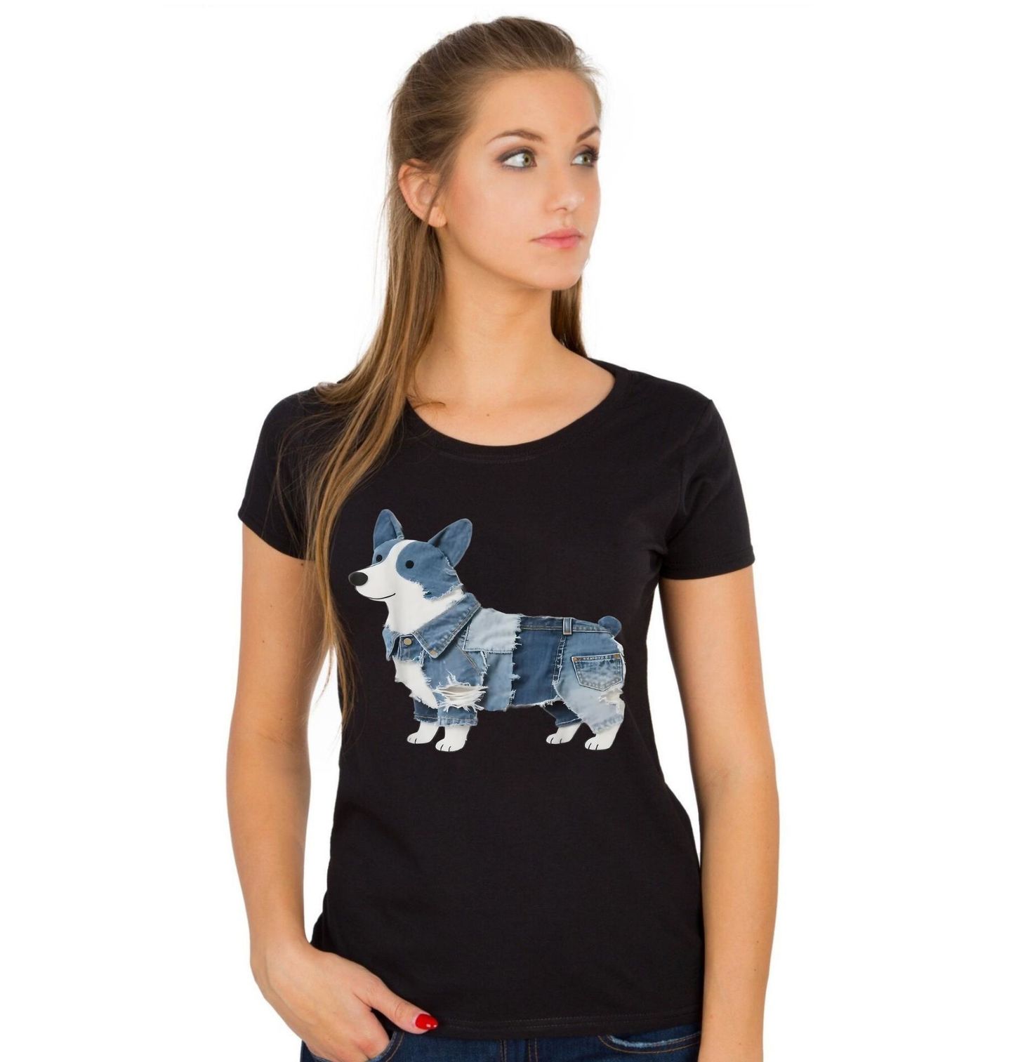Dámské tričko Džínový Corgi. Pes Corgi v džínách přináší jedinečné spojení roztomilosti a módy. Tento stylizovaný pes, konkrétně rasa Corgi, je oblečený do cool oblečku ze starých džín – včetně detailů jako jsou kapsy, roztrhané nohavice nebo límeček. Ideální pro všechny pejskaře.