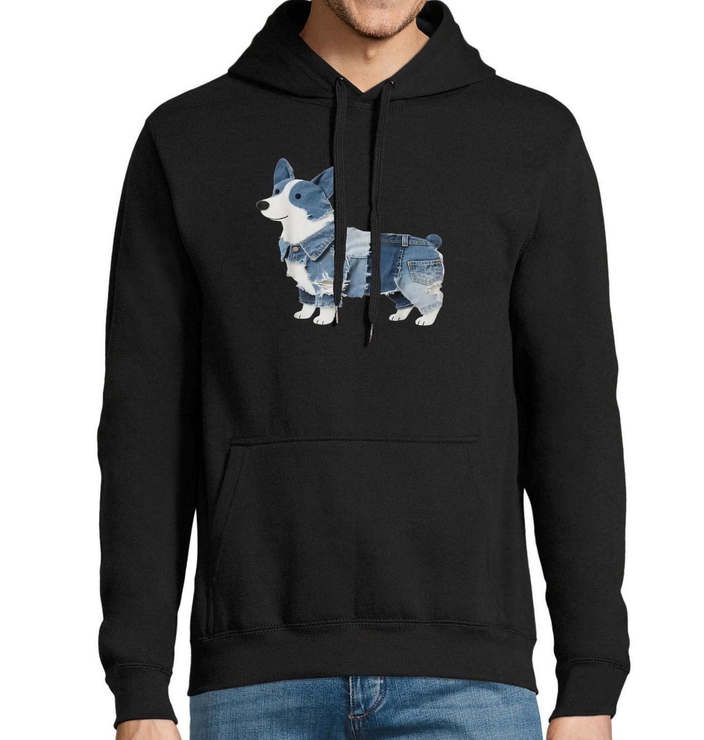 Pánská mikina Džínový Corgi. Pes Corgi v džínách přináší jedinečné spojení roztomilosti a módy. Tento stylizovaný pes, konkrétně rasa Corgi, je oblečený do cool oblečku ze starých džín – včetně detailů jako jsou kapsy, roztrhané nohavice nebo límeček. Ideální pro všechny pejskaře.