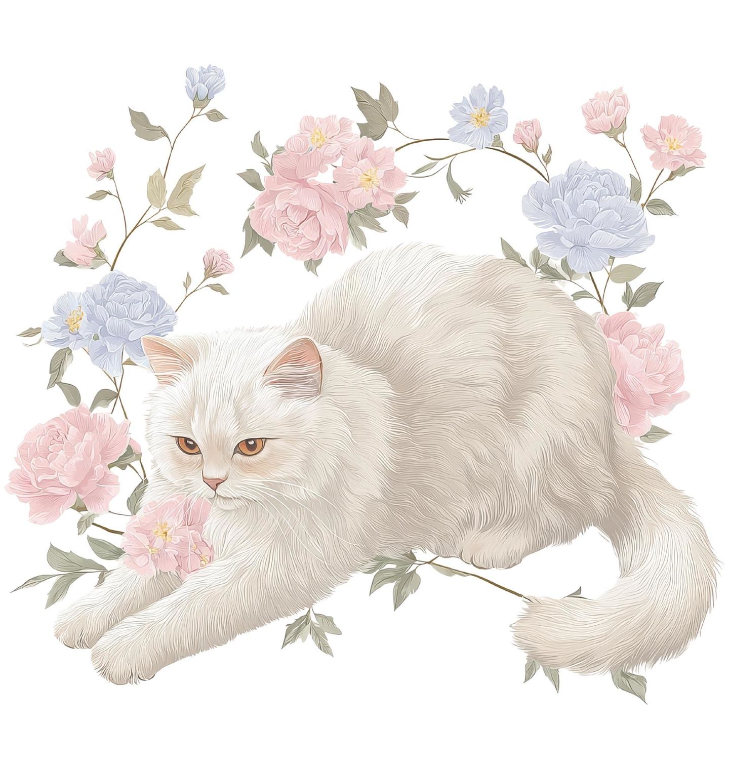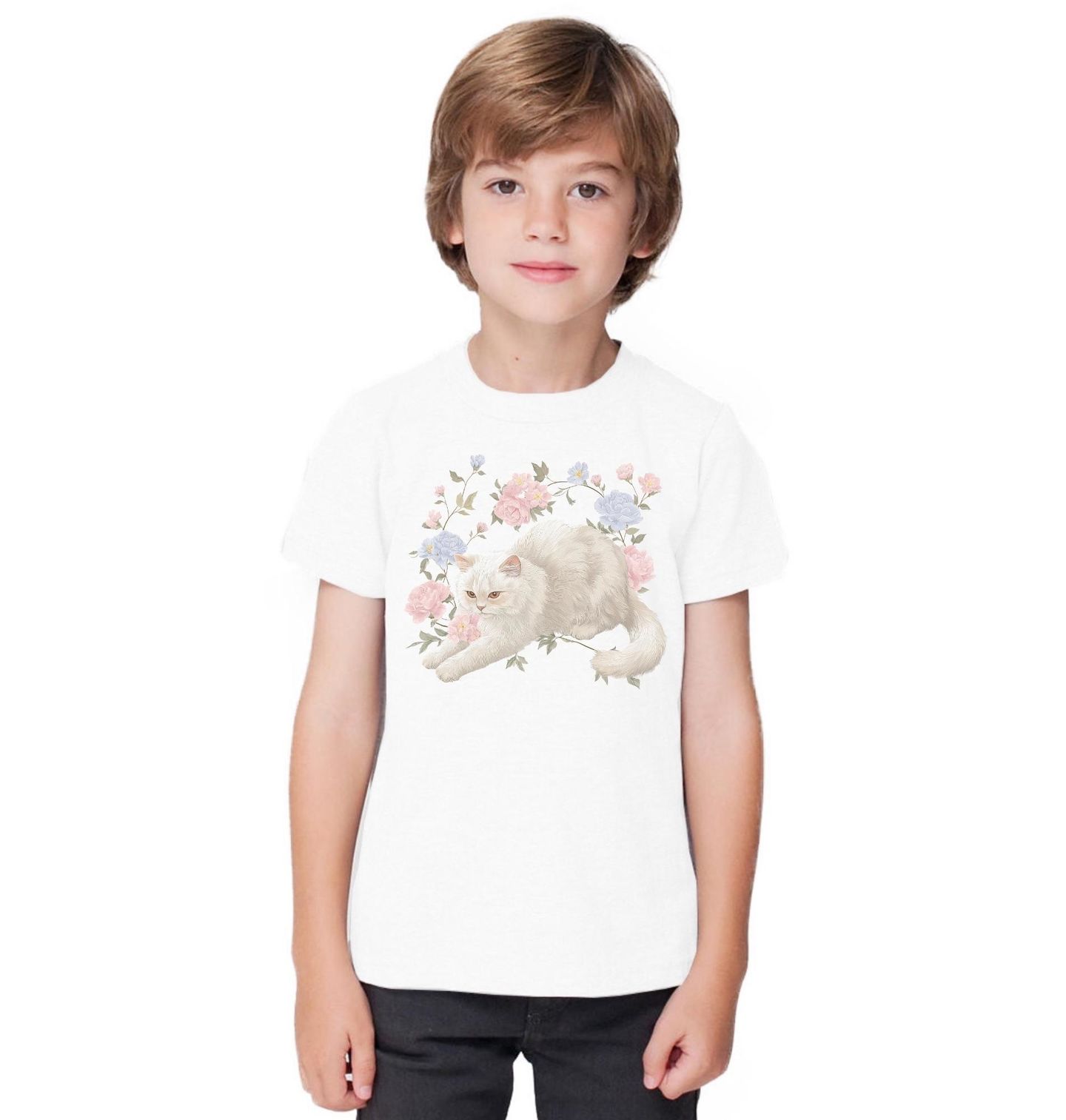 Dětské tričko Elegantní Bílá Kočka. Bílá kočka se pohodlně rozvalila mezi něžnými květinami, tvořícími jemný a romantický rám. Tento motiv krásně spojuje půvab kočky a jemnost květin, což vytváří harmonický a esteticky příjemný design. Ideální pro milovníky koček a přírody, kteří hledají motiv vhodný na plakáty, trička, polštáře nebo dekorace.