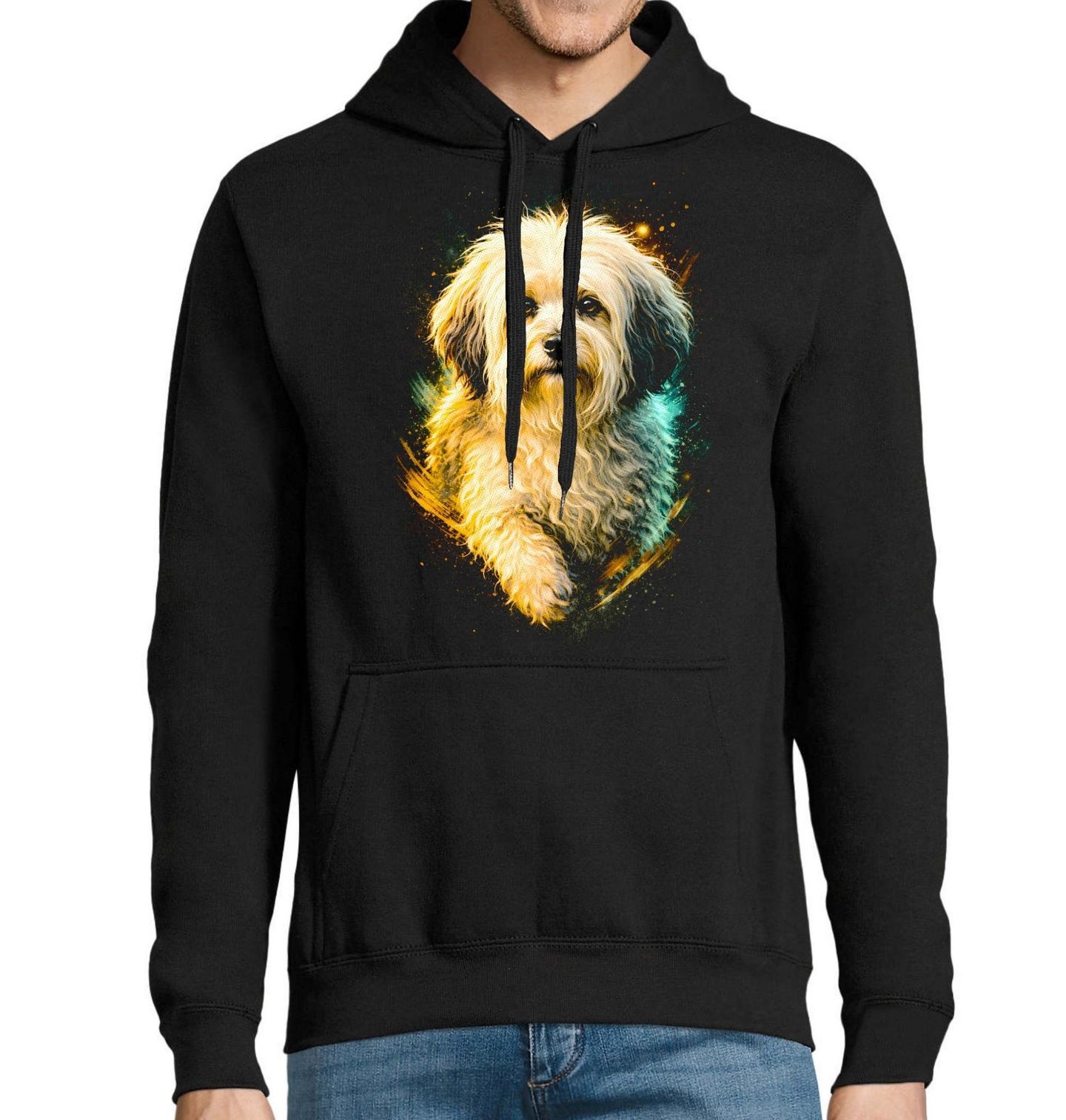 Pánská mikina Elegantní Cavapoo. Tento krásný motiv zachycuje něžného psa plemene Cavapoo v moderním, zářivém stylu plném teplých i chladných barev. Detailní ilustrace zvýrazňuje jemně vlnitou srst, přátelský výraz a roztomilý vzhled, díky kterému je tento pes oblíbeným rodinným společníkem. Ideální volba pro každého pejskař, který chce vyjádřit svou lásku ke svému čtyřnohému kamarádovi originálním způsobem.
