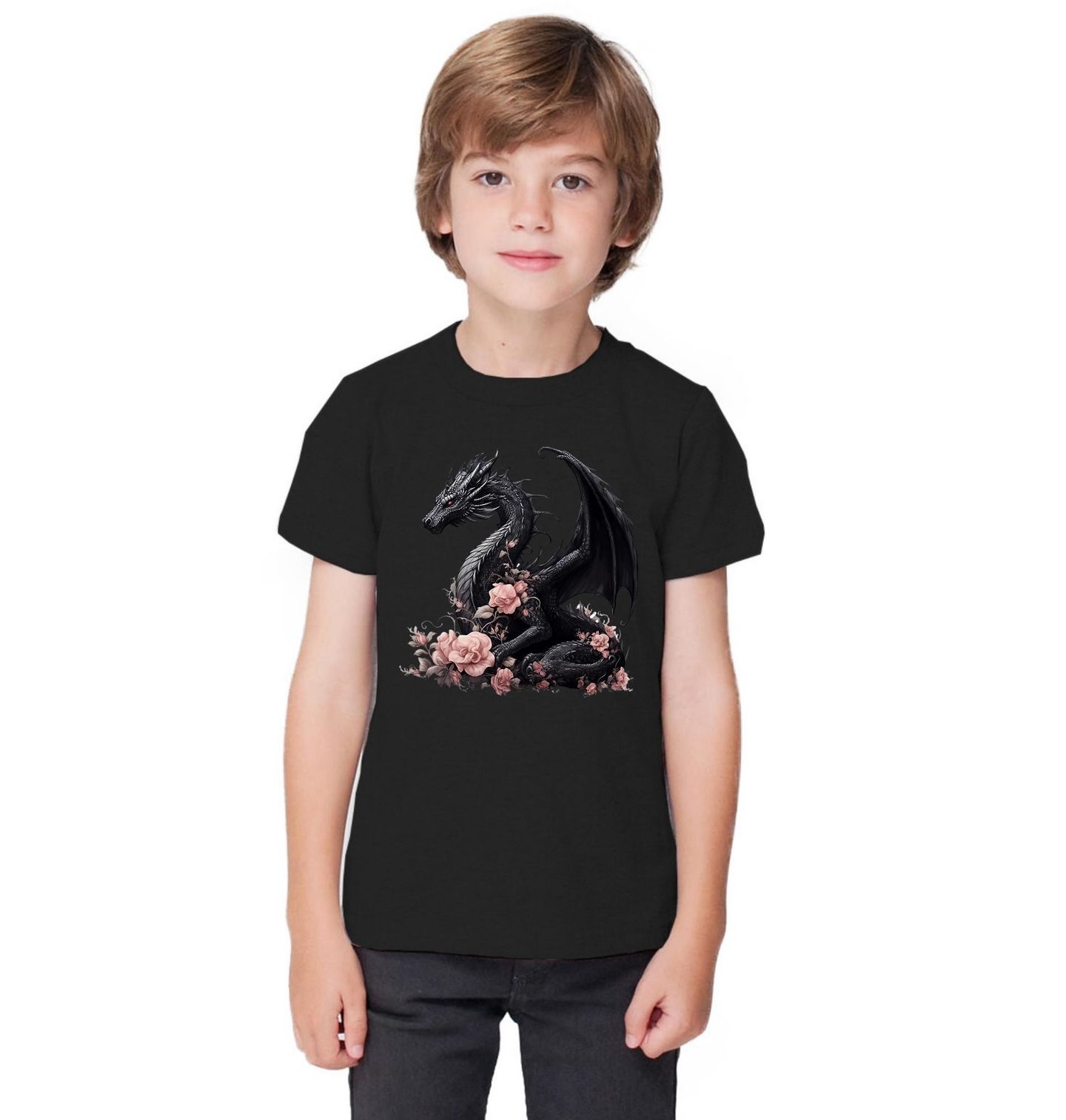 Dětské tričko Elegantní Černý Drak Sakura. Elegantní černý drak obtočený jemnými růžovými květinami vytváří jedinečnou kombinaci síly a křehké krásy. Tento motiv působí tajemně, mysticky a přitom něžně — jako by se zrodil přímo ze světa fantasy legend a kouzel. Ideální pro všechny, kdo milují květiny, draky a originální umění s nádechem temné romantiky.