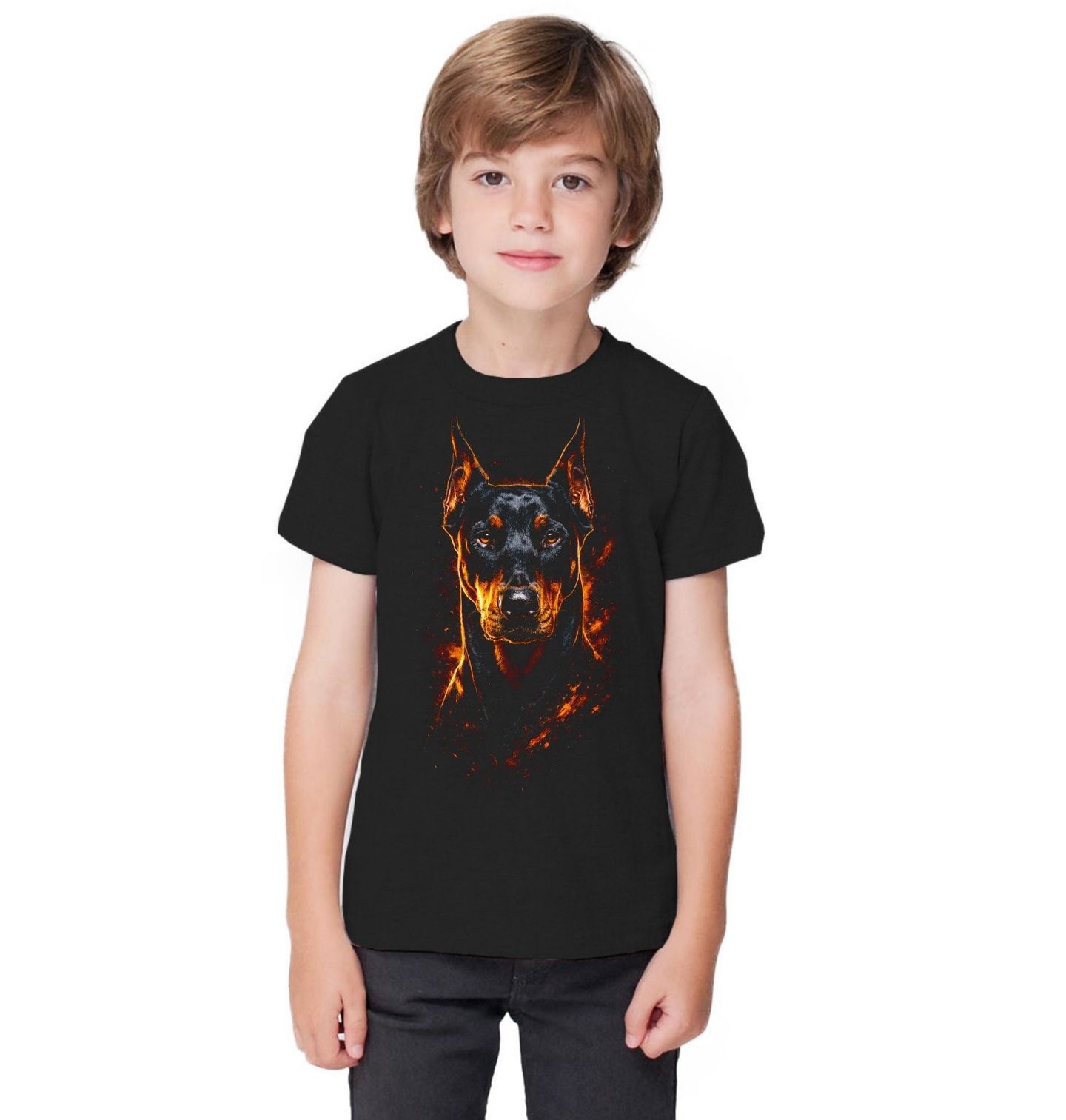 Dětské tričko Elegantní Dobrman. Tento působivý motiv zachycuje plemeno Dobrman, které je symbolem elegance, síly a inteligence. Ostré rysy, vzpřímené uši a soustředěný pohled dokonale vystihují charakter tohoto výjimečného plemene. Každý pejskař, který obdivuje silné a oddané psy, si tento design zamiluje. Dobrman je velmi inteligentní a loajální pes, který vyniká nejen svou ochranitelskou povahou, ale i elegancí a rychlostí.