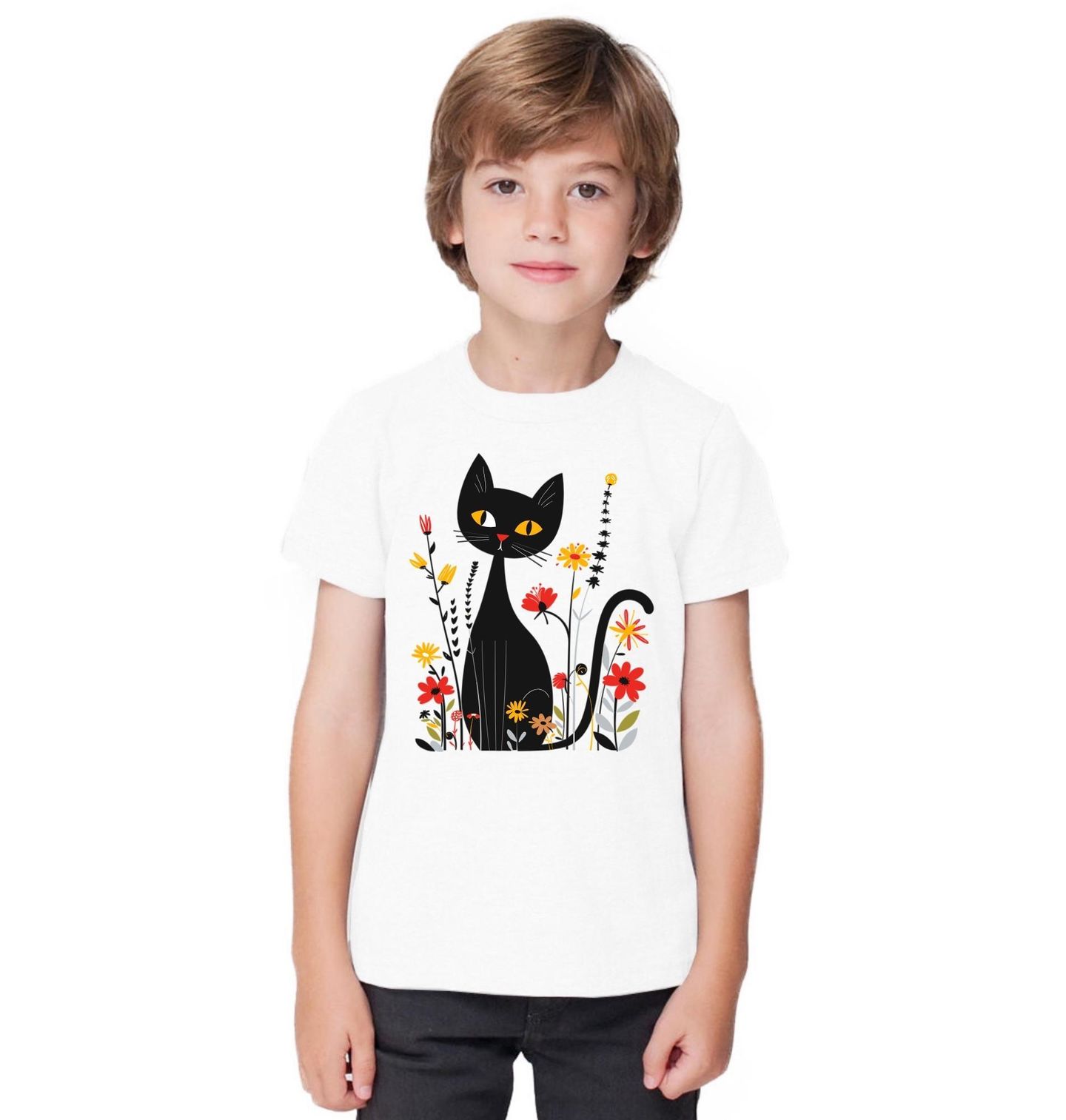 Dětské tričko Elegantní Kočka v Květinách. Kontrast tmavé siluety a hravých květinových detailů vytváří harmonický design, který působí moderně i nadčasově. Kočka v tomto provedení symbolizuje eleganci, klid a přirozenou krásu. Květiny kolem ní dodávají motivu lehkost a pozitivní energii, díky čemuž je ideální pro všechny milovníky přírody i koček.